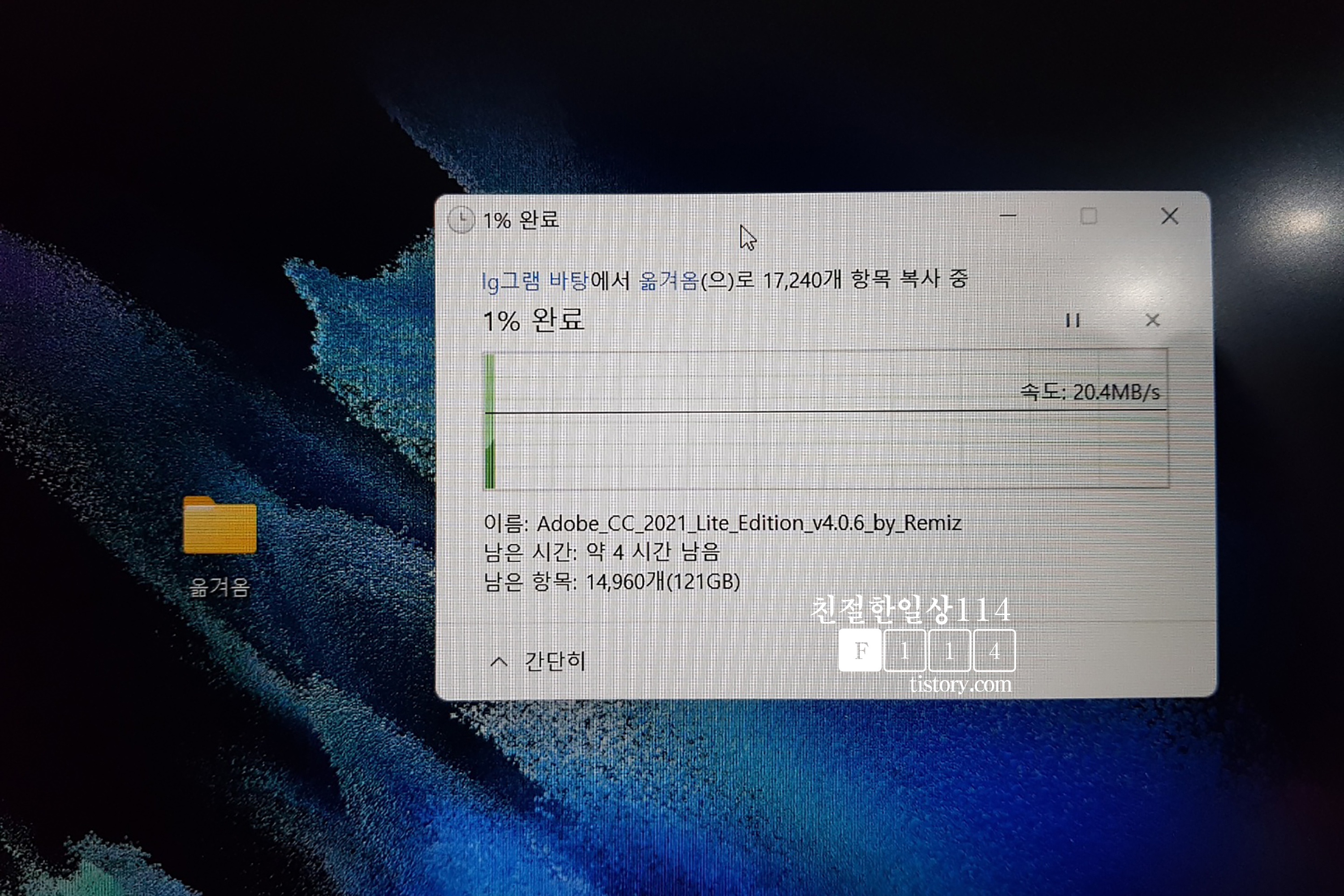 데이터가 옮겨지는 동안 남은시간과 전송속도가 표시된다. 속도는 평균 18~20MB/s 로 나왔고 밤 12시 안되서 시작해 3시가 조금 넘어서 끝났다. 가정내 단독 와이파이라고 하더라도 남들이 인터넷을 많이하지 않는 시간대에 해야 속도가 잘 나와 시간을 절약할 수 있겠다. 이렇게 큰 데이터를 외장하드 없이 무선(와이파이)으로 옮기는 방법에 대해서 알아보았다. 살면서 자주 있는 일은 아니겠지만 한번쯤 필요할때 요긴하게 써먹을 수 있는 정보를 남겨본다.