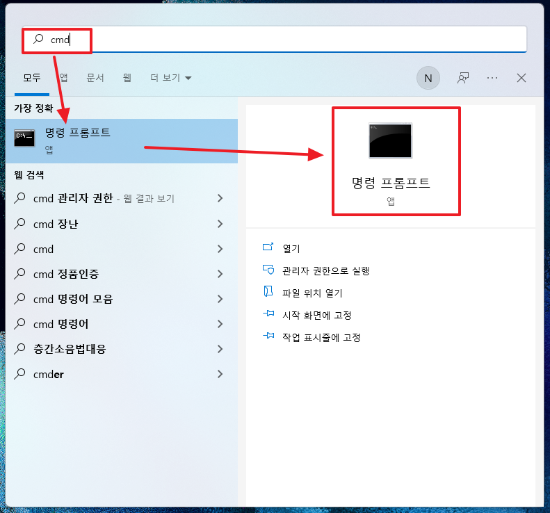 내보내는 노트북 바탕화면 검색에서 ‘cmd’ 입력 후 명령프롬프트를 실행.