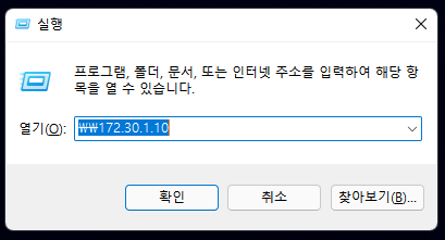 파일을 받을 노트북에서 윈도우 + R 버튼을 클릭한다. 실행창에서 Enter 키 위에 있는 원화 “\’ 2개를 입력하고 3번에서 확인한 IP 주소를 입력하고 확인 클릭한다.