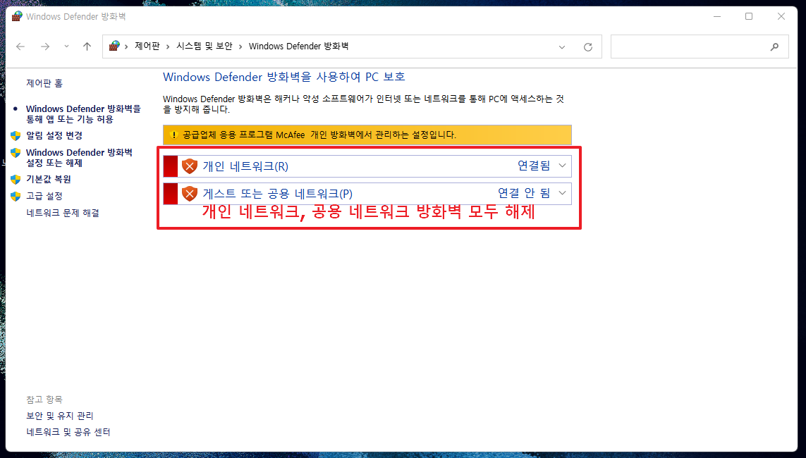 두 노트북 모두 바탕화면 검색에서 ‘방화벽’을 입력 후 '방화벽 상태 확인'으로 들어가서 해제한다. 방화벽 해제는 ‘개인 네트워크’와 ‘공용 네트워크’ 모두 해제(사용안함)로 설정한다.