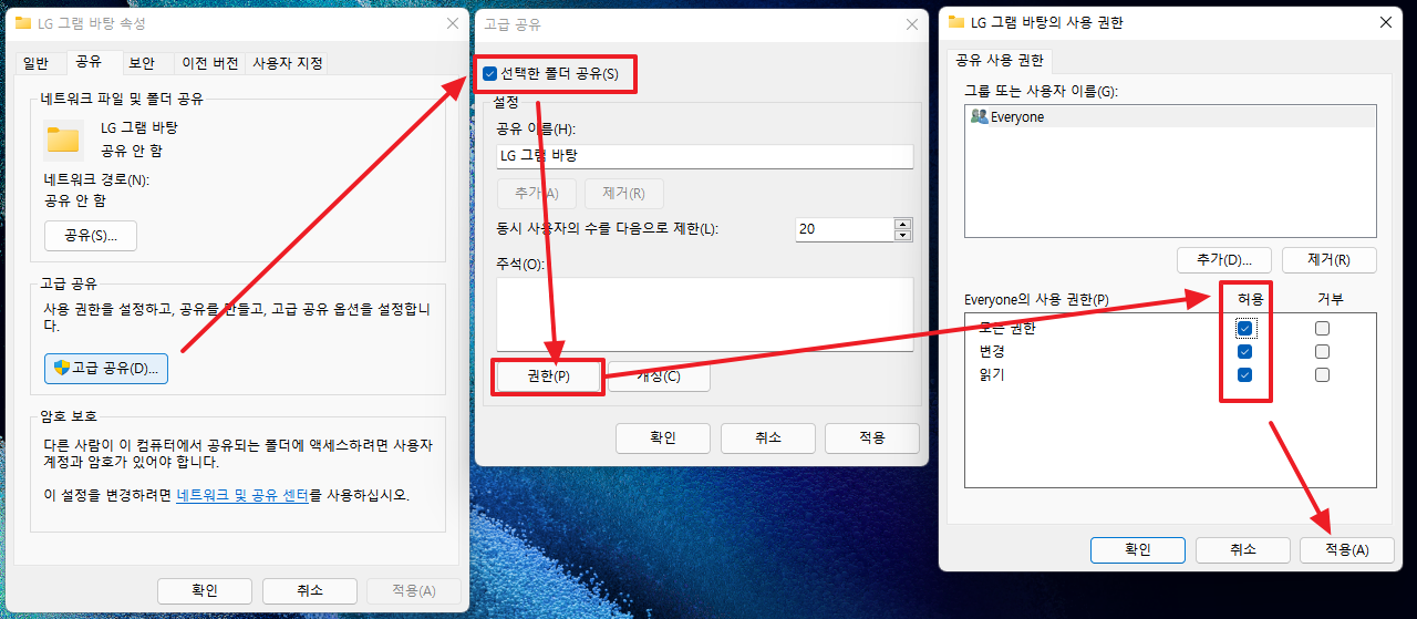 생성된 새폴더를 마우스 우클릭해서 속성 -> 공유 -> 고급공유 -> 선택한 폴더공유(체크) -> 권한 -> 모든 권한 체크