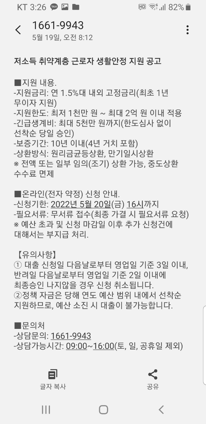 본 문자는 지원대상을 확대하여 기존 정책지원자금 이용자 역시 추가 신청 가능한 사업으로 신청은 온라인 및 전화상담을 통해 비대면으로 신청가능하며, 또한 예산 조기마감 예정으로 22.05.20(금) 16시까지 신청 마감함을 알려드리오니, 마감 전 신청하시길 바랍니다.