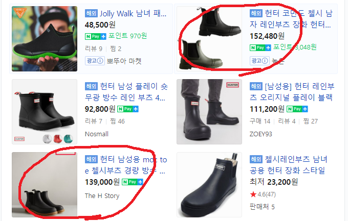 그래서 이미 알고 있던 헌터 브랜드의 숏부츠와 시장표 반장화의 가격을 비교해 보았다.