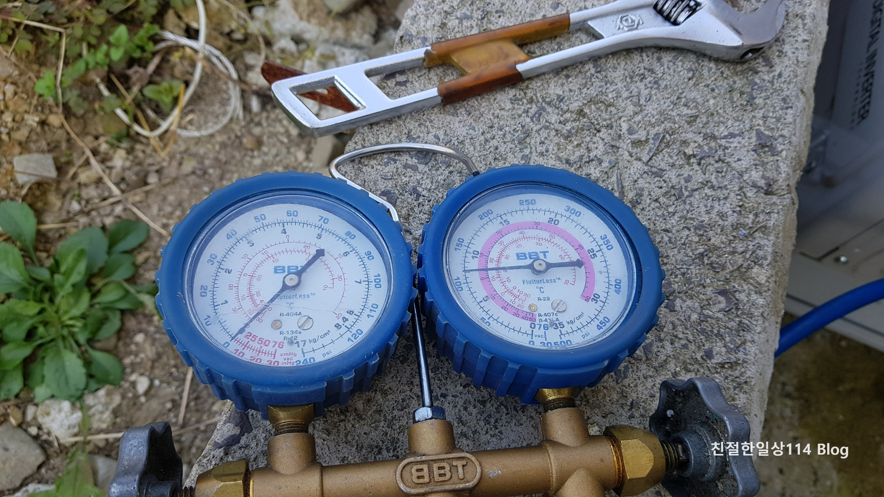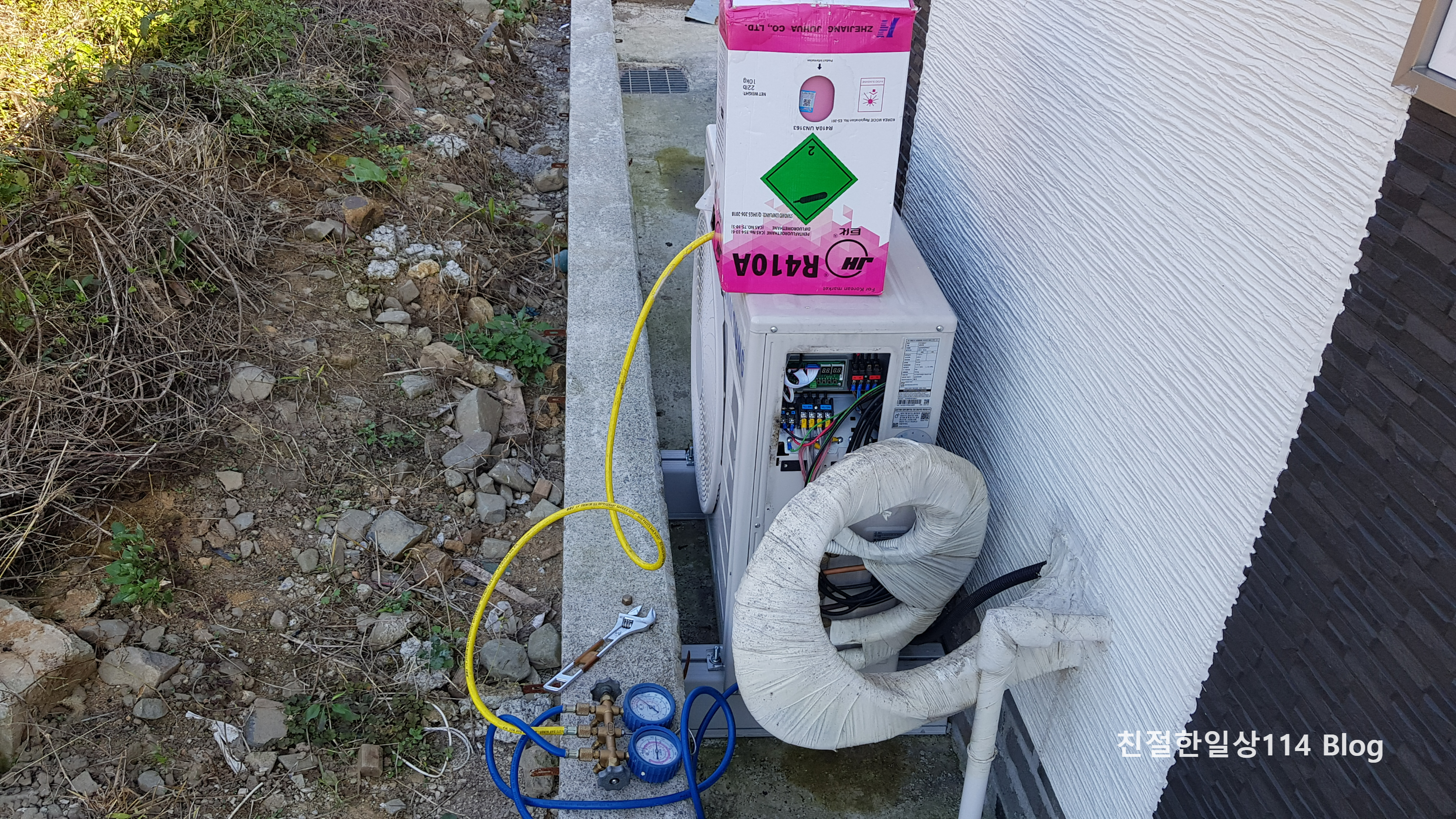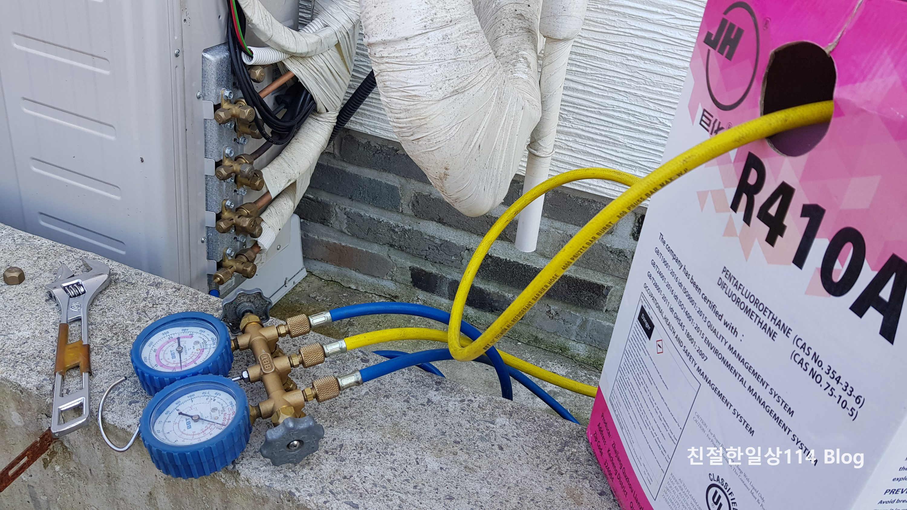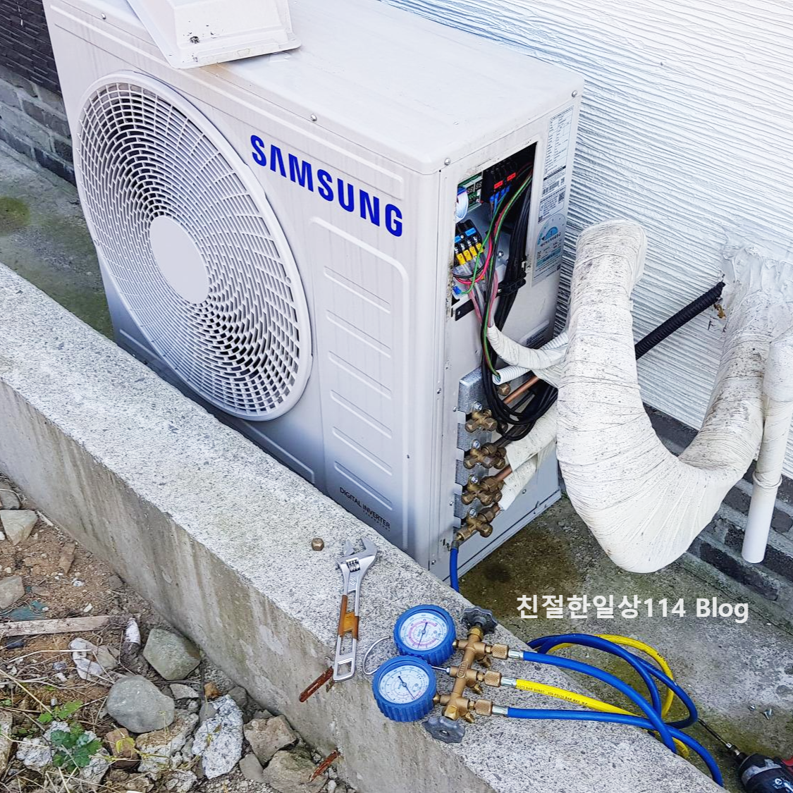 이렇게 가져온 계기판을 실외기에 연결하고 한동안 지켜보고 있다. 이상하게도 에어컨이 꺼지지 않는다. 민망할 뻔했지만 그래도 전문가는 원인을 진단해 냈다. 설치 당시 집 내부 구조가 복잡해서 배관을 길게 뺐다고 한다. 배관 길이가 길어 냉매도 많이 넣었다고 하는데 그래도 부족했나 보다. 냉매가 부족해서 에어컨이 꺼진거라고 한다.
