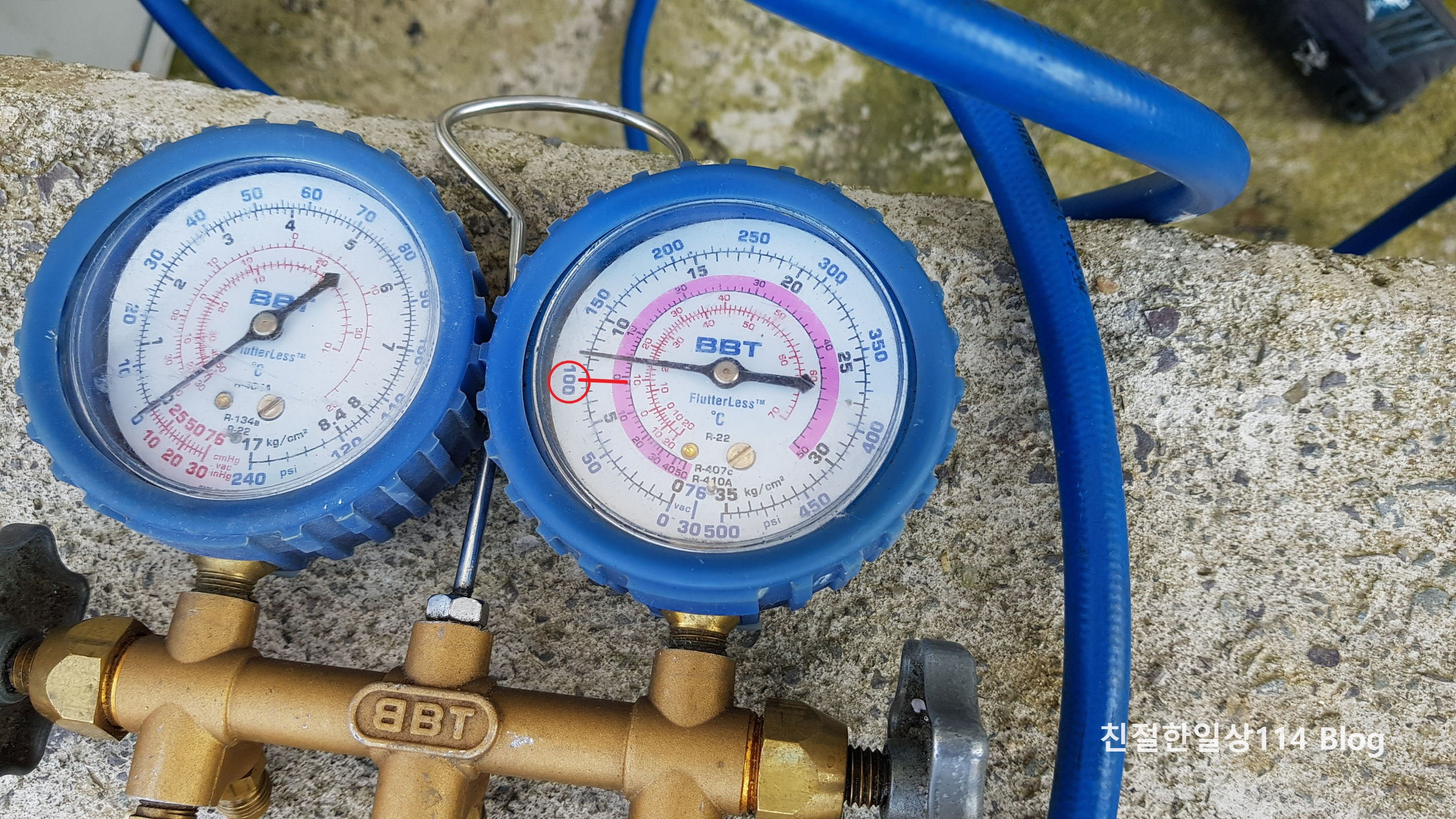 게이지 보는 법을 알려주신다. 오른쪽 계기판에서 빨간색으로 해놓은 100 이하로 냉매가 떨어지게 되면 냉매부족으로 에어컨이 꺼지게 된다고 한다. 에어컨을 가동하고 시간이 지나면서 게이지가 서서히 떨어져서 냉매가 부족하다고 판단했다고 한다.
