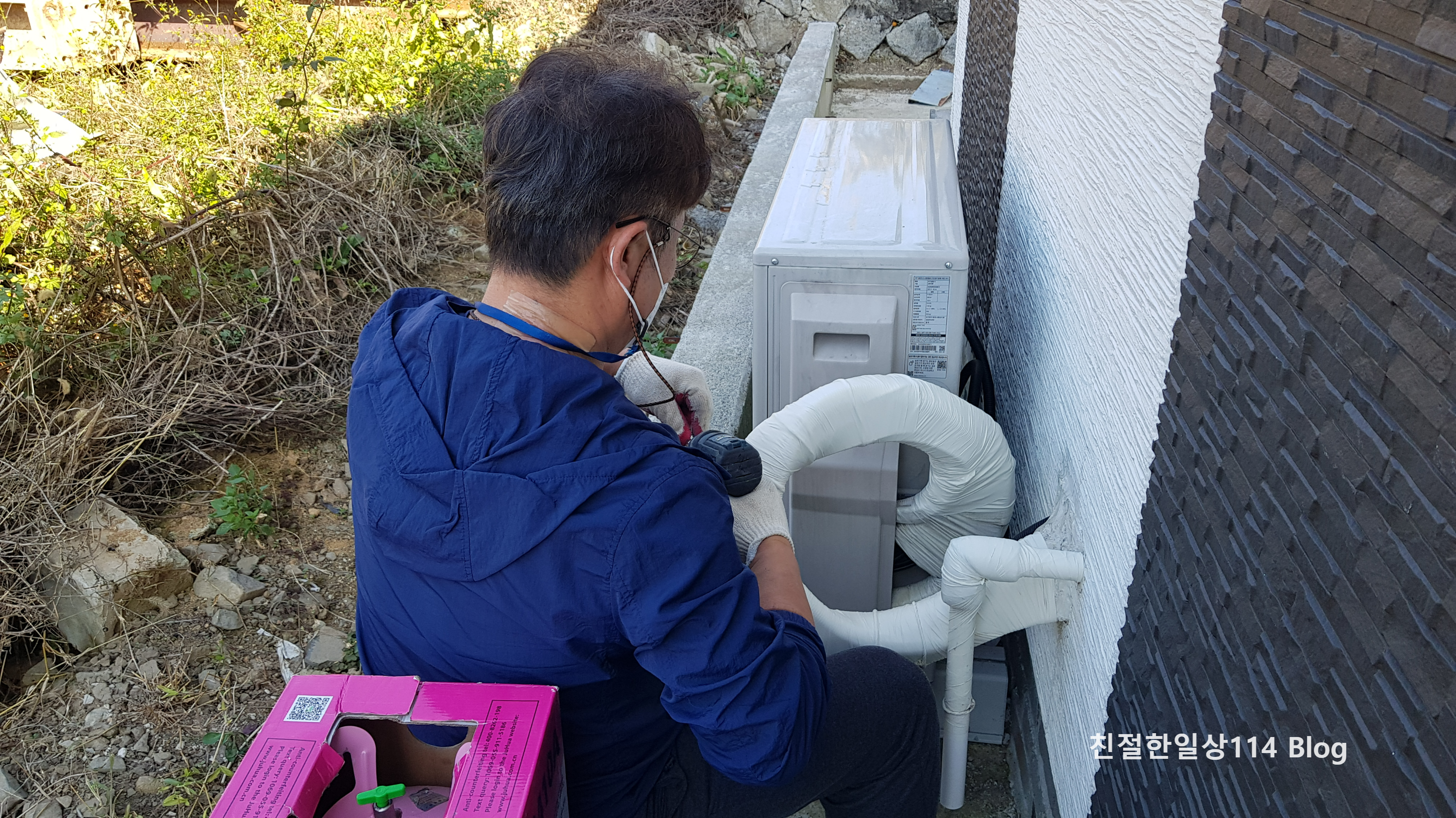 핑크색 통에 에어컨 냉매가 들어있었다. 부족한 에어컨 냉매 보충 중이다.