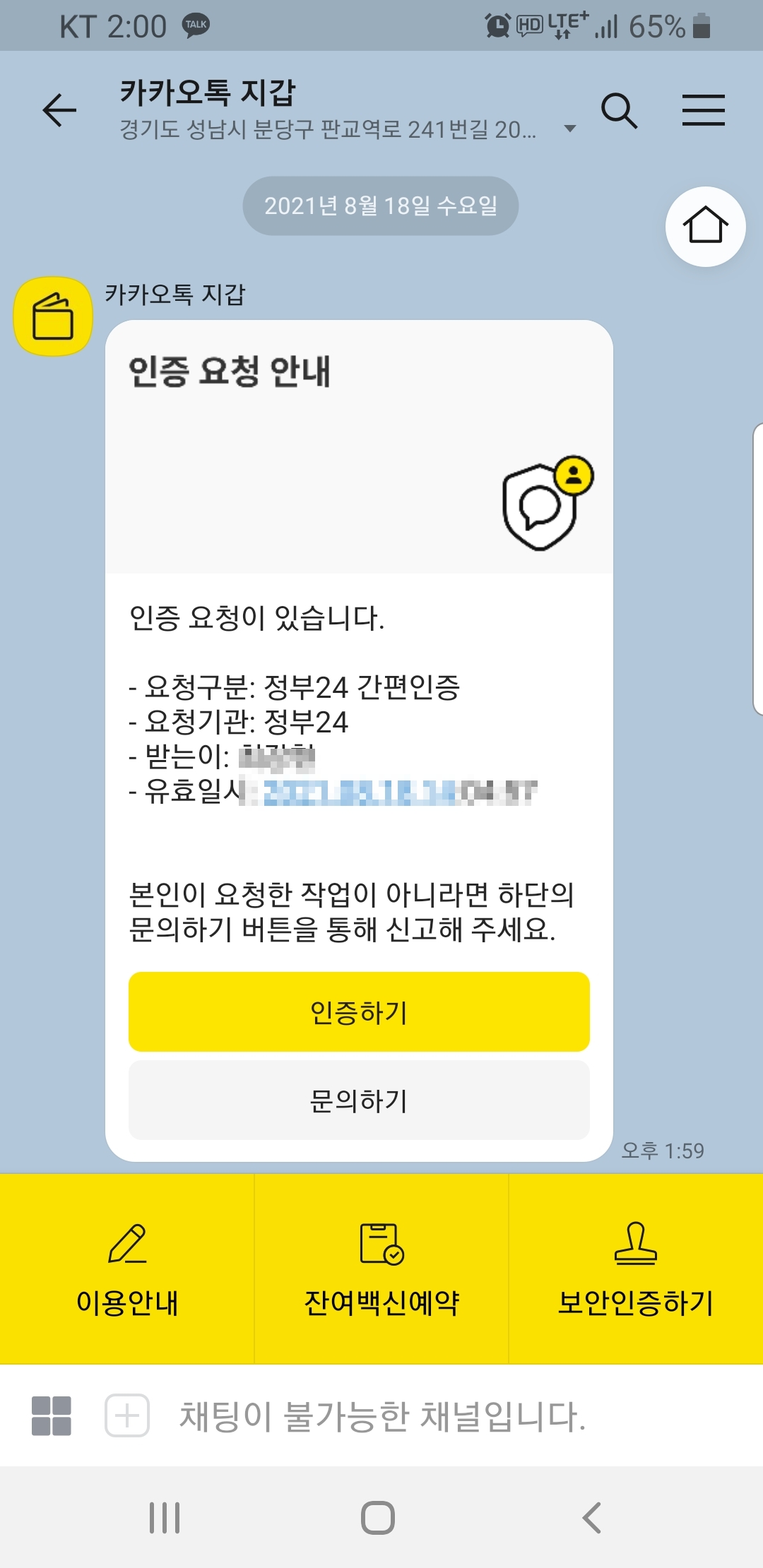 PC 화면에는 위와 같은 화면으로 카카오톡 인증 진행에 대한 안내가 나오고 본인의 휴대폰 카카오톡으로 인증요청 메세지가 들어와 있을 것이다. 휴대폰에서 카카오톡을 열어 카카오톡에서 온 대화창에 들어가 '인증확인'을 클릭한 다음 비밀번호를 입력 해주면 된다.