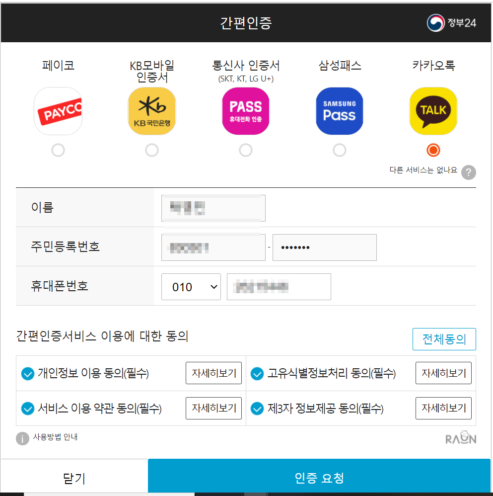 간편인증에는 페이코/KB모바일인증서/통산사 인증서/삼성패스/카카오톡 이렇게 5가지 있으며 본인이 자주 사용하는 인증서를 선택해 진행하는게 좋다. 필자는 카카오톡으로 진행했고 카카오톡 인증절차를 남겨본다.