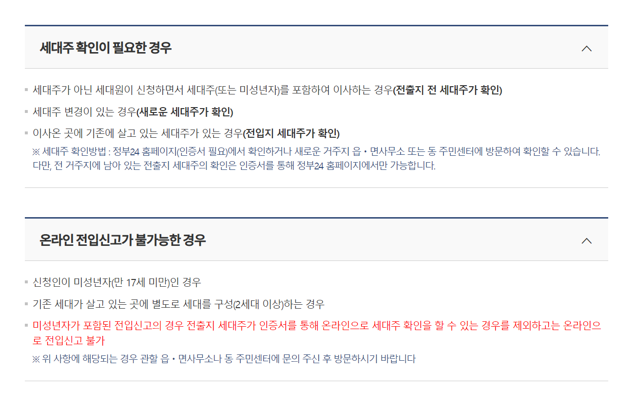 전입신고시 세대주 확인이 필요한 경우 와 온라인 전입신고 불가능한 경우
