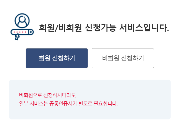 만약 본인이 정부24 홈페이지에 가입이 되어있다면 회원으로 신청하기를 클릭해 인증서 확인 후 로그인하여 전입신고를 신청할 수 있다. 필자는 비회원으로 신청신청 진행하였다. 비회원으로 신청을 하더라도 인증서가 필요하다.