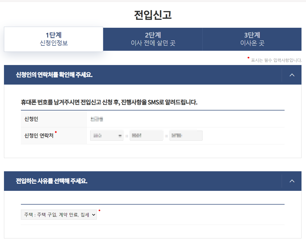 비회원으로 로그인 후 전입신고서를 작성할 차례이다. 신고서는 1단계부터 3단계까지 있으며 1단계에서 신청인 정보를 입력하면 된다.