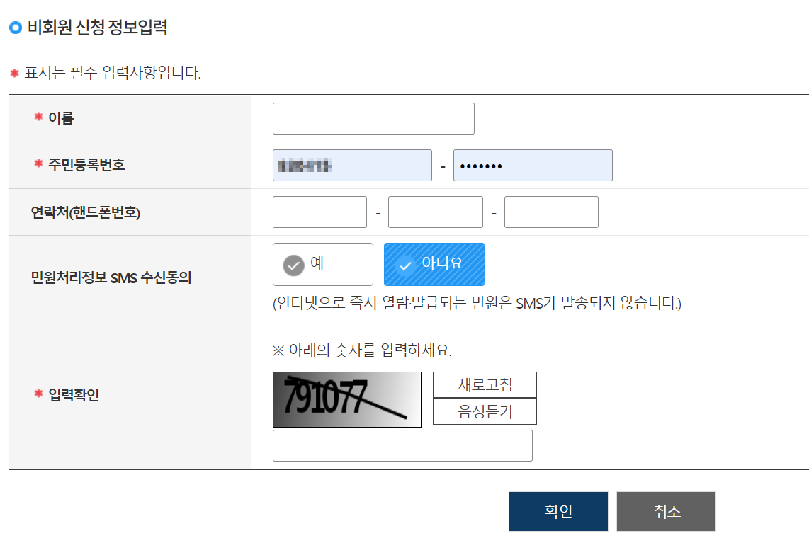 신청정보 입력에는 빨간색으로 별표시기 되어있는 필수정보만 입력하면 된다. (이름/주민등록번호/입력확인) 필수정보 입력 후 아래쪽의 확인 버튼을 클릭하여 다음으로 넘어간다.