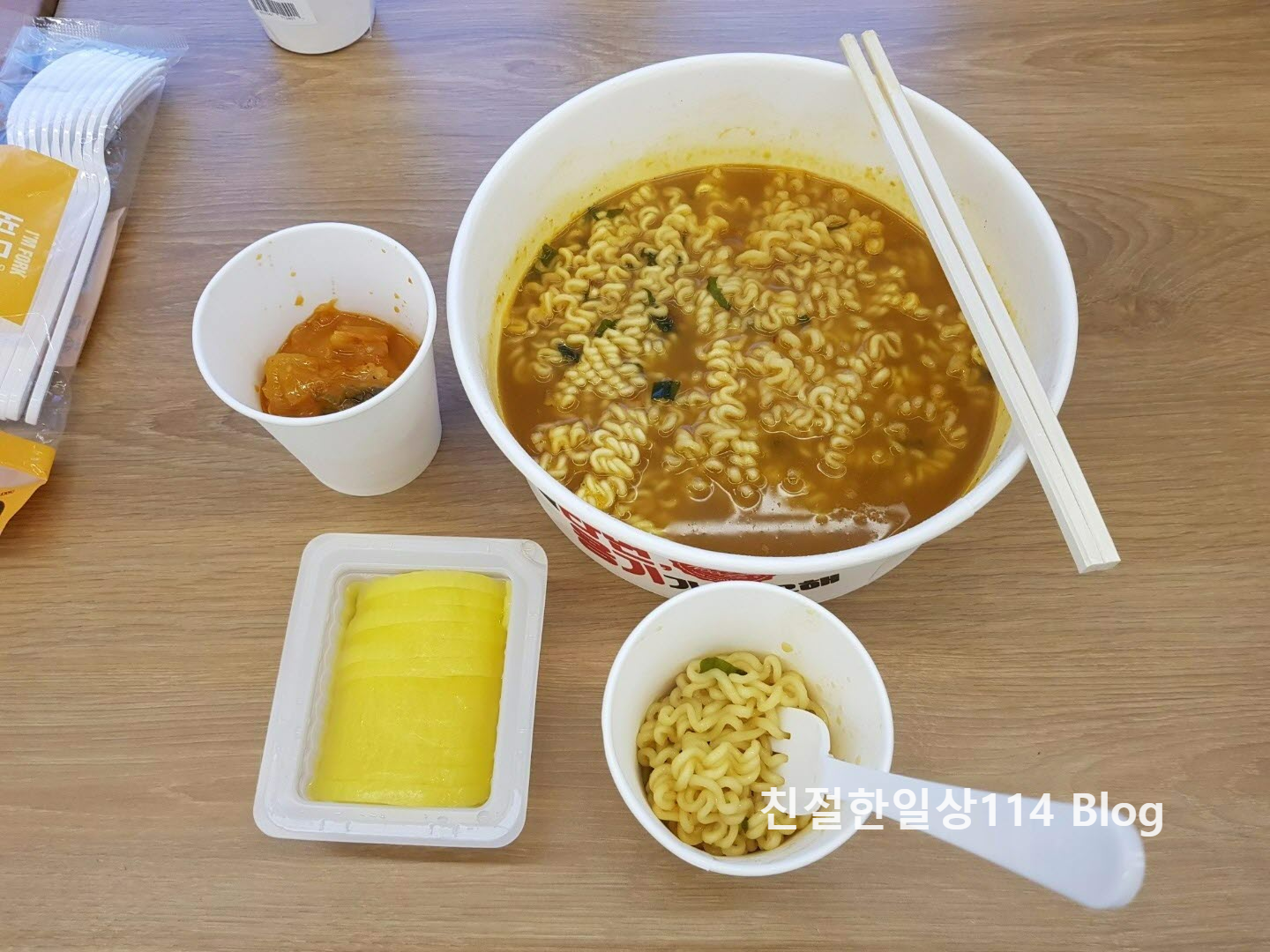 즉석라면과 단무지 + 볶은김치 세팅완료 되었다. 컵에 덜어놓고 식혀 먹기 위해 종이컵과 포크를 산다. 그리고 정신없이 먹었다.