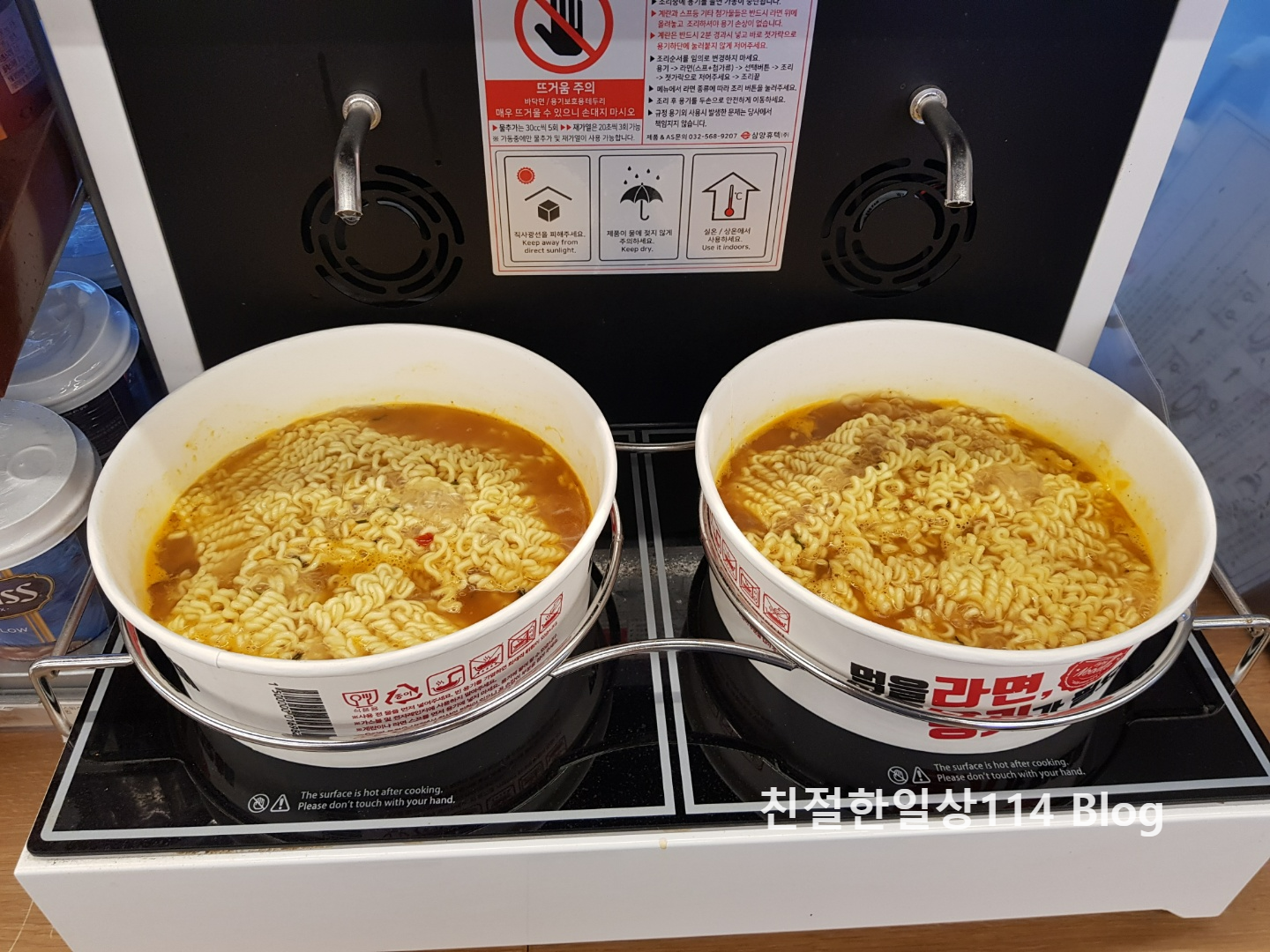 왼쪽이 찜질방에서 사용했던 즉석라면 기계이며 오른쪽이 이마트24 편의점의 즉석라면 기계이다. 외관은 다르지만 간단한 작동방식과 끊이는 시간은 비슷했다. 그리고 뜨거운물 추가, 재가열의 기능도 동일하게 들어가 있다. 즉석라면 기계에 대한 차이점은 외형 말곤 아직 모르겠다.