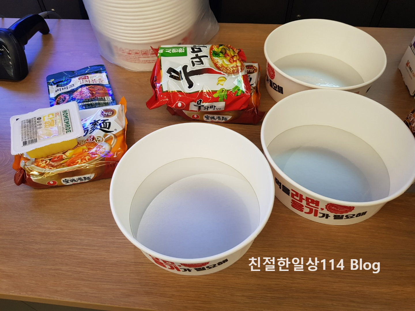 고른 봉지라면을 카운터로 가져가 즉석라면을 먹을거라고 하면 용기를 준다.