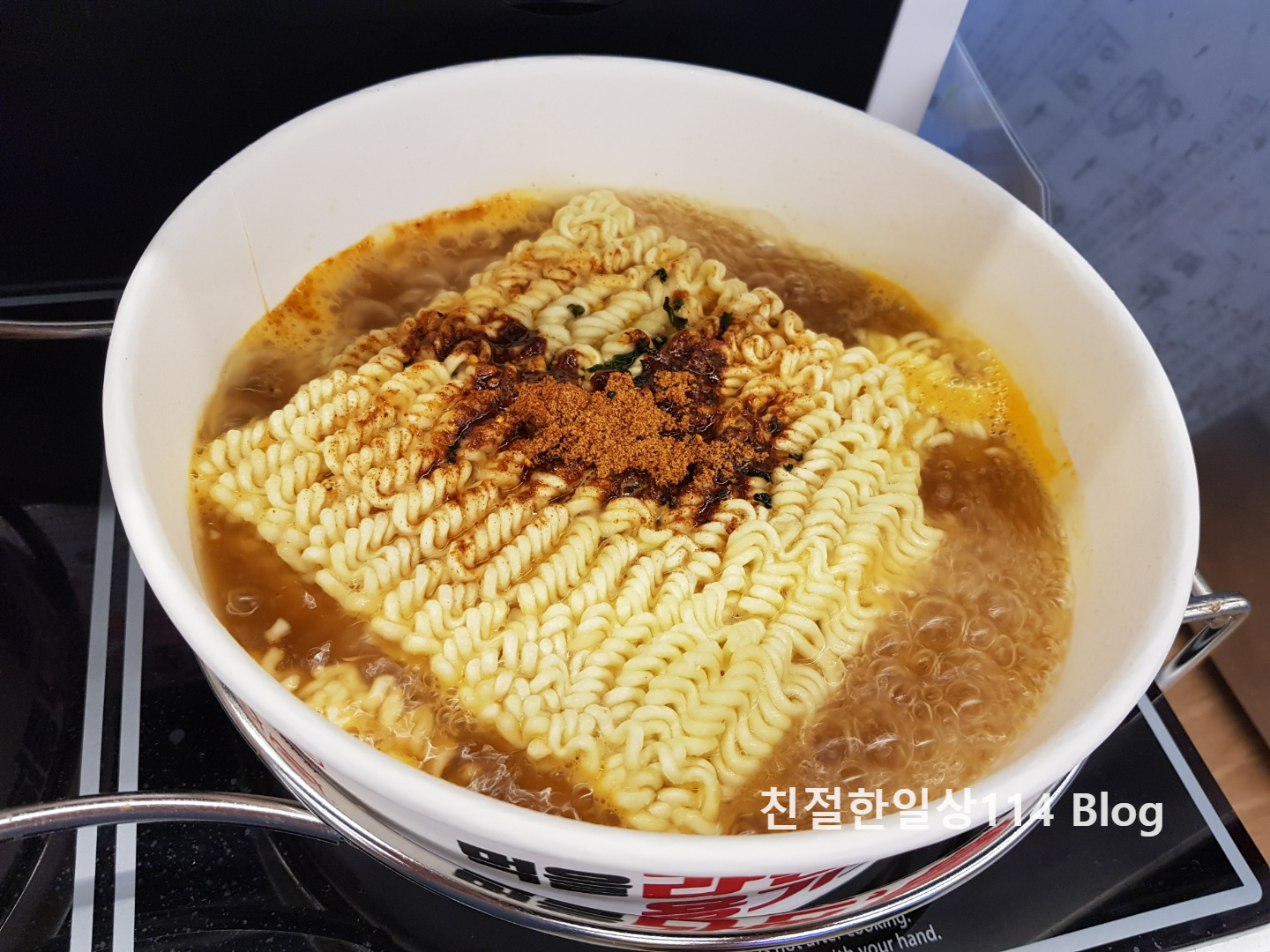 라면이 끓는 도중 섞어주면 더 맛있게 먹을 수 있다.