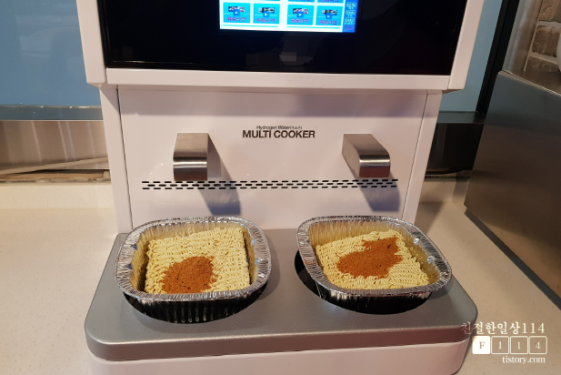 그릇에 라면과 스프를 한꺼번에 넣고 '일반라면' 버튼을 눌러 조리를 시작한다.