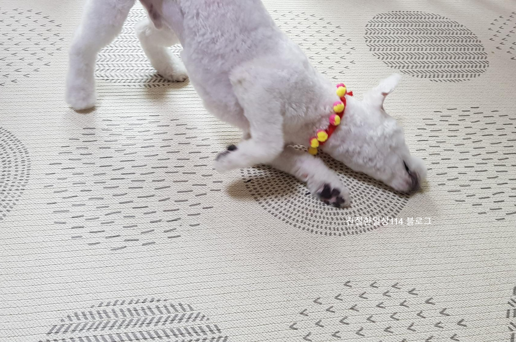 마늘이는 3개월에 한번 미용실에 데려가서 털을 깍인다. 미용실에서 털을 깍고오면 느낌이 이상한지 바닥에 얼굴을 부비고 뒹굴고 한다. 아마 털을 막 깍고나서 이질적인 느낌이 들어서 그런것도 있고 2~3시간씩 미용을 하면서 받은 스트레스를 푸느라 그런것 같다.