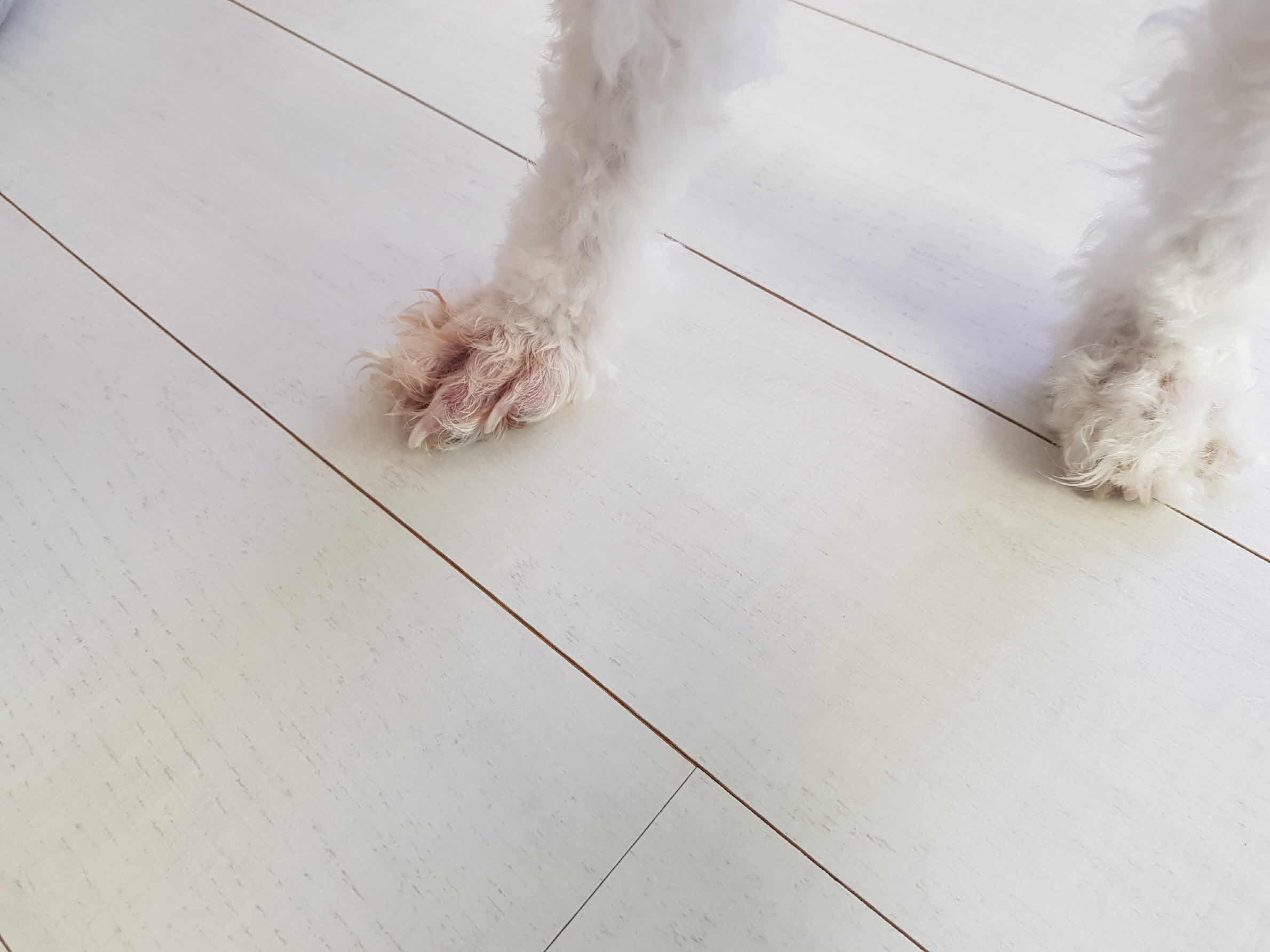 우리집 막둥이인 강아지가 발을 열심히 핥고 깨물어서 털은 젖어있고 피부는 빨갛게 부어 올랐다.