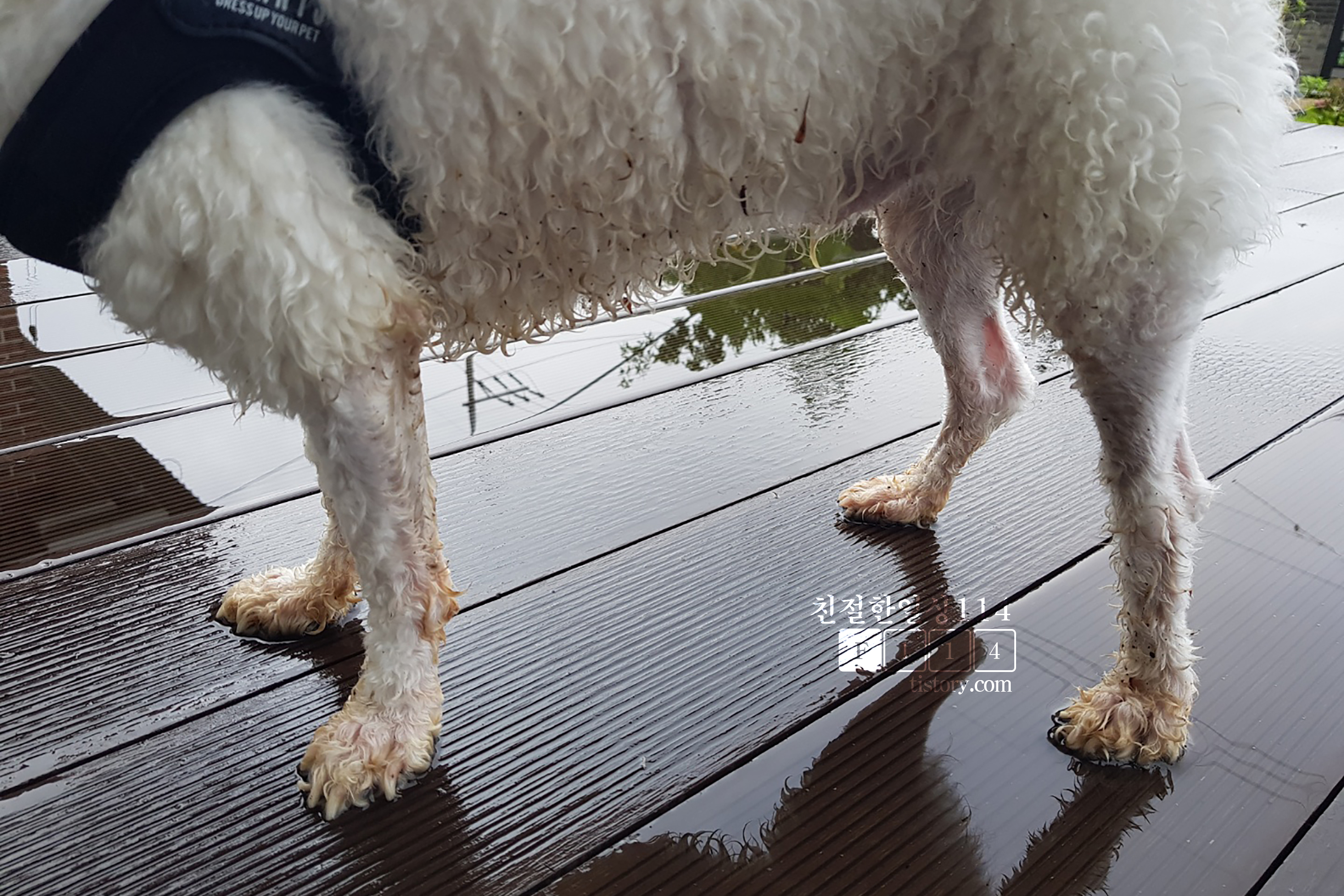 하지만, 꼭 좋은것만은 아니다. 산책 후 집 안으로 들어가야하는데 강아지 발과 배의 털이 엉망이 되어버렸다. 사람도 비가 온 뒤 젖은 길을 걸을때 바지 뒷부분에 물이 튀어 젖듯이 맨발로 다니는 강아지의 발은 말할것도 없고 배도 빗물에 젖고 흙과 먼지가 함께 섞여서 뭍었다.