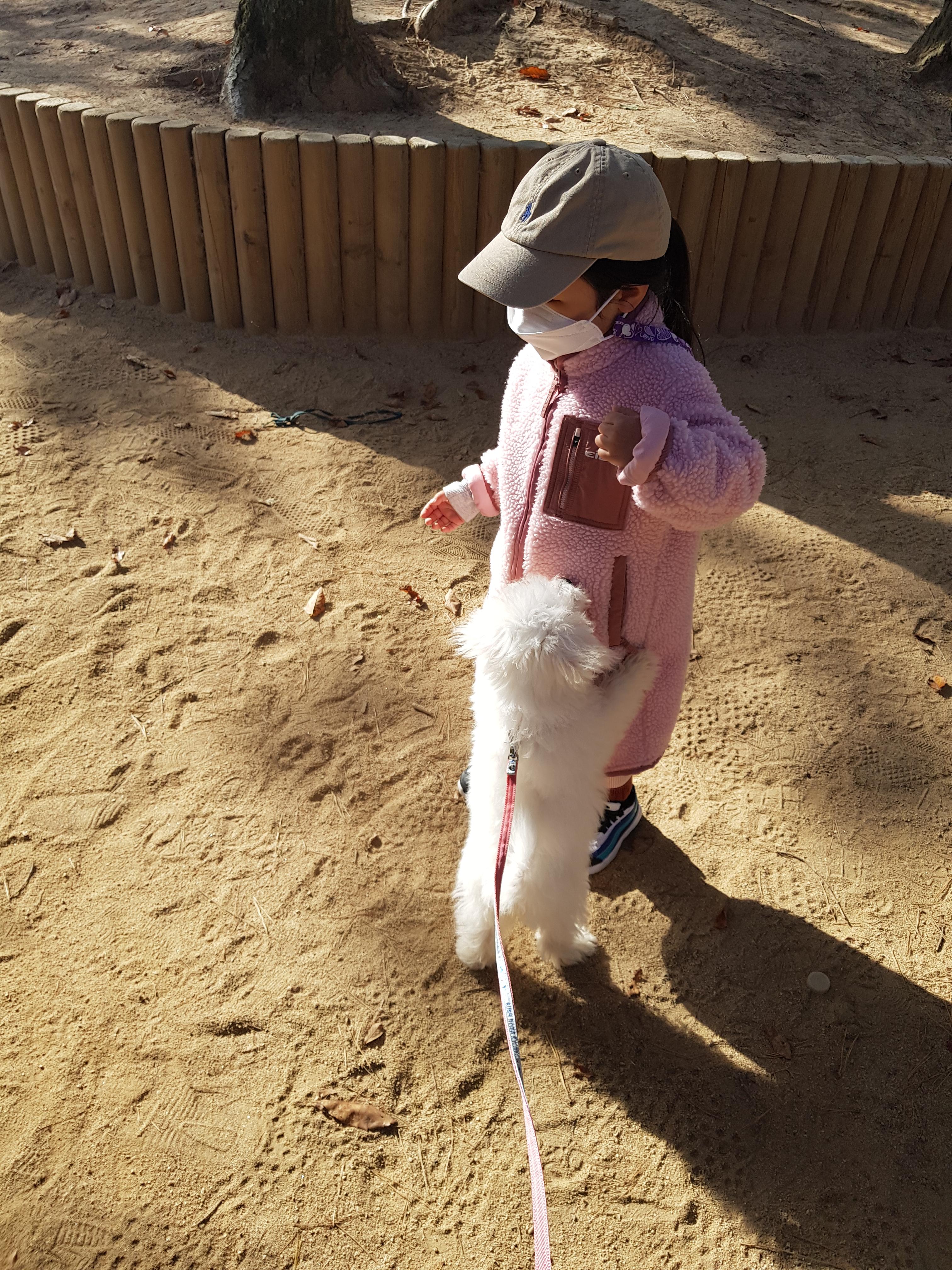 산책을 나가면 딸아이도 너무 좋아하고 마늘이도 신나해서 다 좋은데 문제는 다녀와서 씻기고 털 말리는게 보통일이 아니다. 힘들고 시간이 걸리더라도 혼자서 할 수 있다면 산책을 자주하겠지만 와이프와 둘이서 한명은 잡고 한명은 씻기고 여기다 딸아이도 씻기고 챙겨줘야하니 산책을 매일 나가는건 무리고 일주일에 2~3번 정도가 최선이다.