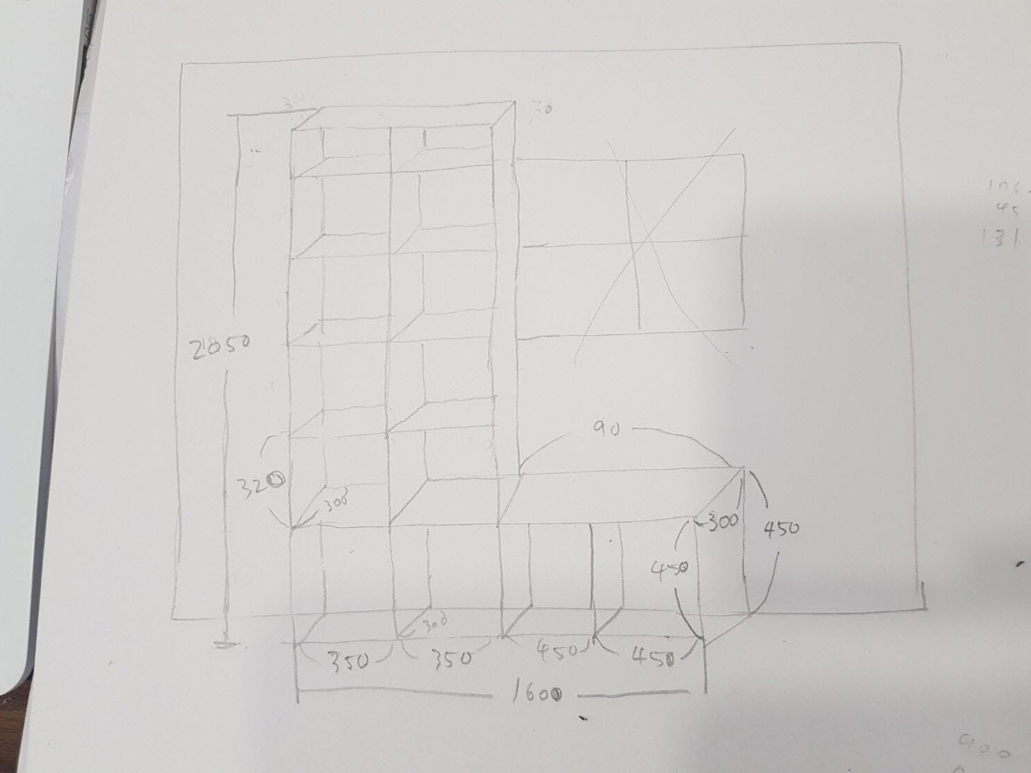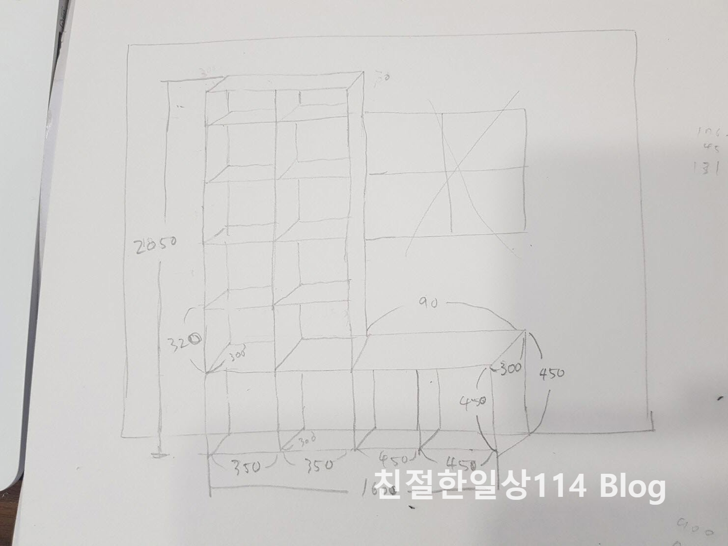 나무 책장 맞춤제작 업체에 견적을 받기 위해 책장의 사이즈를 재고 수납칸을 손으로 그려서 보내주었다.