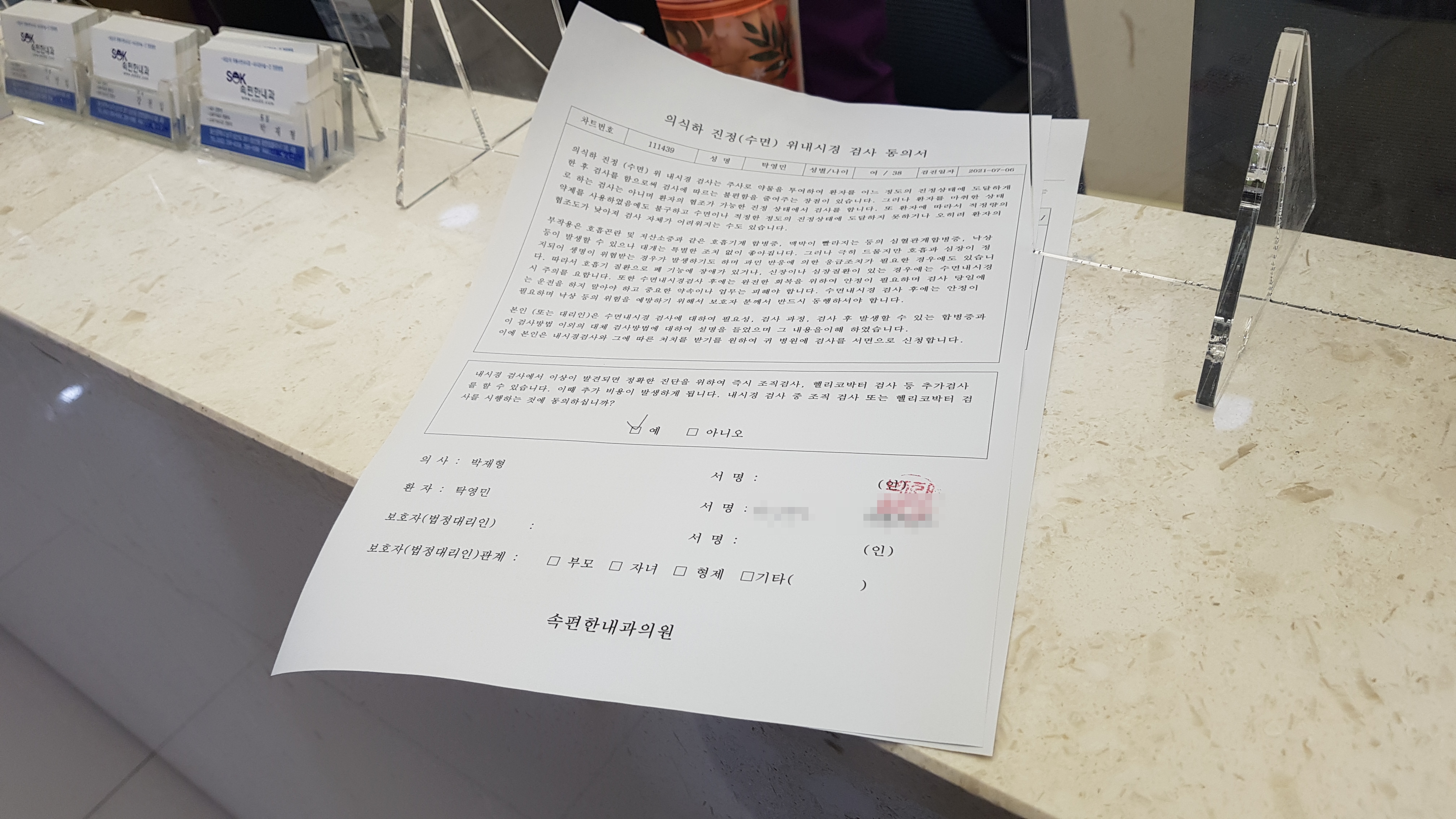 수면내시경으로 하는 아내는 수면 위내시경 검사 동의서를 작성한다.