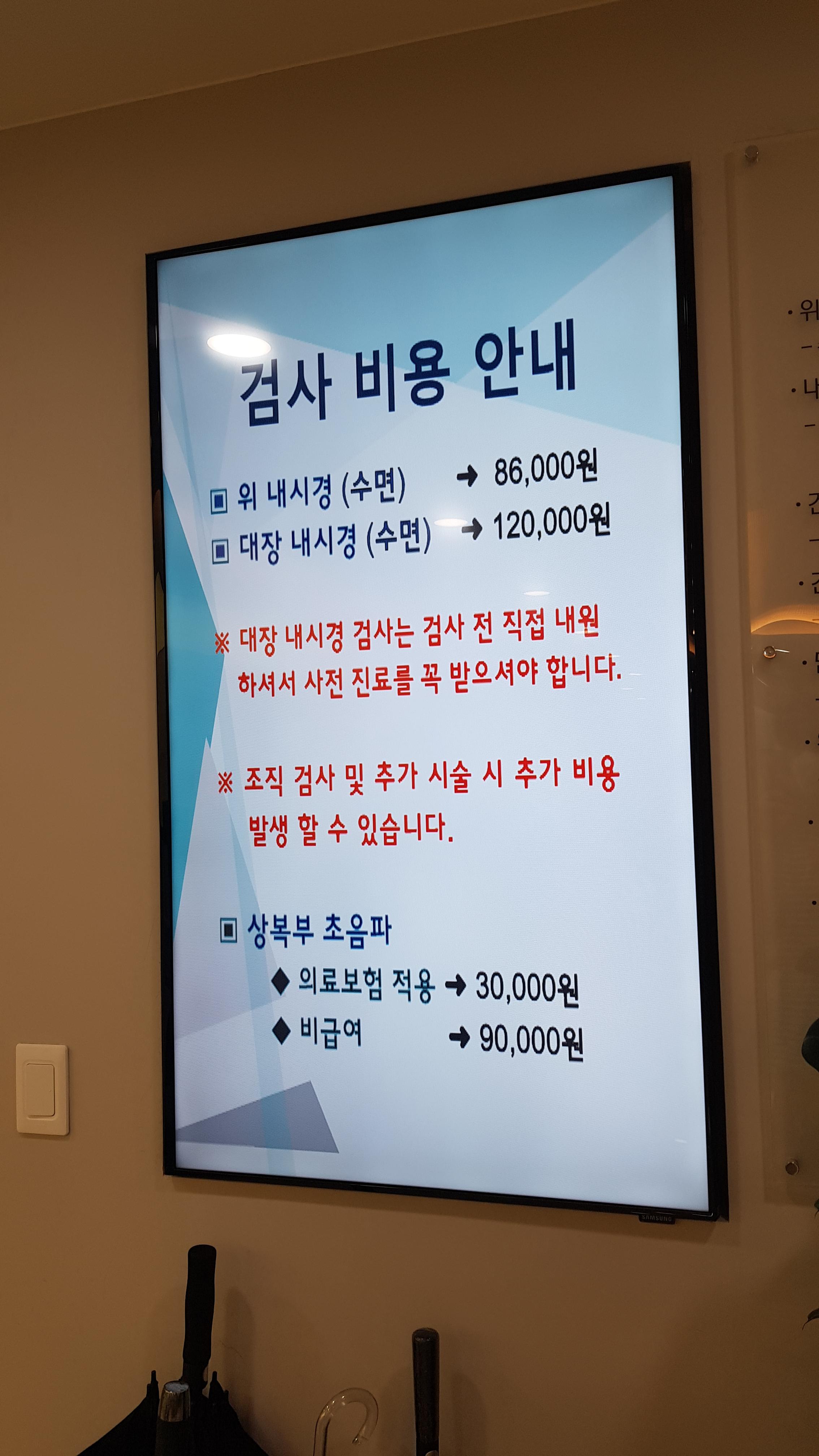 혈압측정과 동의서를 작성하고 한 15분 정도 기다리니 이름을 호출한다. 담당 원장실로 들어가서 위내시경 전 문진을 한다. 아내가 먼저 문진을 받게되어서 같이 들어가서 얘기를 들었다. 한달도 더 전부터 음식을 먹으면 소화가 안되고 통증이 있으며 설사를 한다는 증상을 이야기 한다. 음식 종류에 따라 증상이 다른지, 체중감소가 있었는지와 가족력 등을 물어봐 대답해준다. 그리고 앉은 자세에서 어깨를 만져보고 등을 두드려 보며 통증 유무를 확인해 본다. 뒤쪽에 있는 침대에 누워 복부를 이곳저곳 눌러보며 통증여부를 확인한다. 꽤나 자세히 사전 검사를 한다. 문제가 있어서 그런가 싶었는데 다행히도 특별한 이상은 없다고 한다. 이렇게 사전 검사를 마치고 위내시경 검사를 기다린다. 이후에 필자도 같은 원장에게 같은 내용과 방법으로 사전 검사를 받았다.