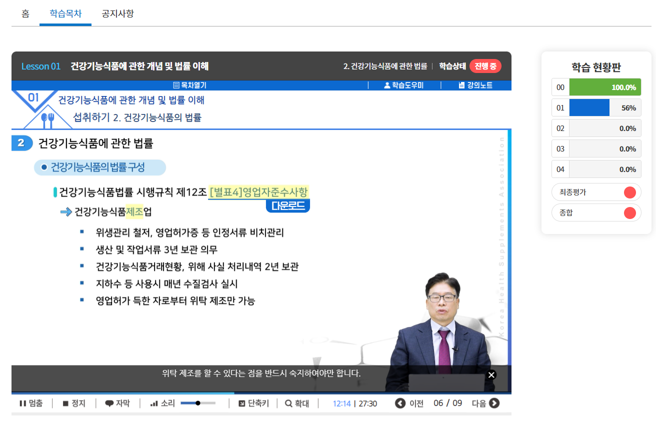 건강기능식품 판매 교육 화면으로 오른쪽에는 현재까지 학습한 현황판이 실시간으로 보여진다. 건너뛰기 기능은 바라지 않지만 재생속도 조절 기능은 있었으면 좋을것 같다.
