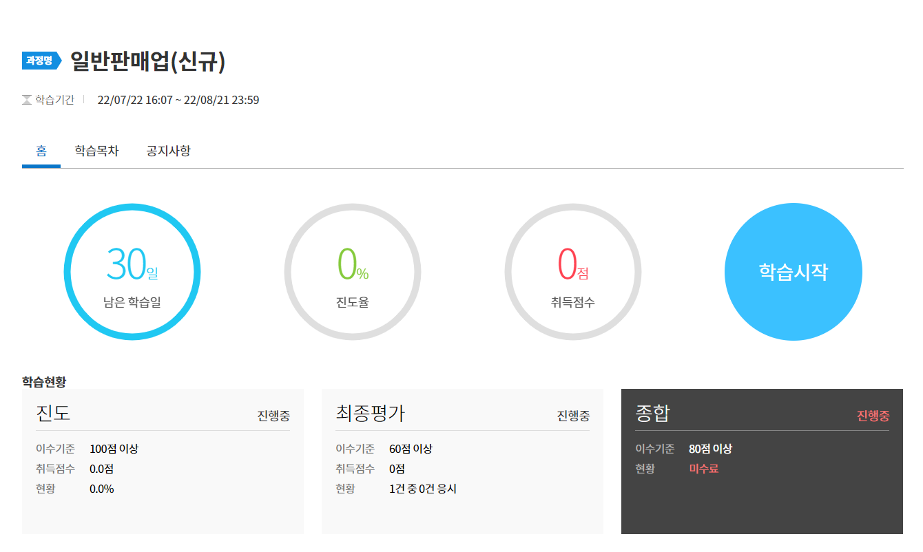 학습은 30일 이내에 들으면 되고 이수기준으로는 진도는 100%, 최종평가(시험)는 60점이상이면 된다.