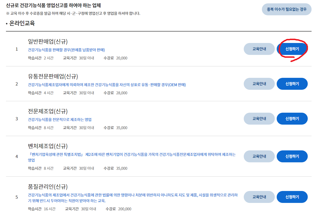 교육신청을 클릭해서 들어가면 총 5종류의 교육이 나온다. 완제품을 납품받아 판매할 수 있는 가장 기본적인 교육인 '일반판매업(신규)'를 선택하면 되겠다.