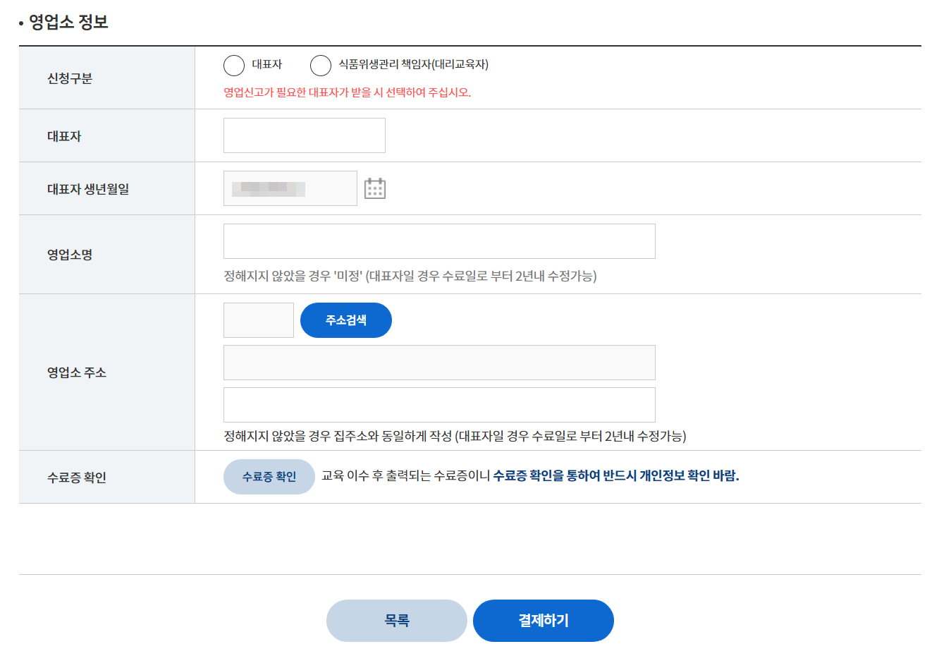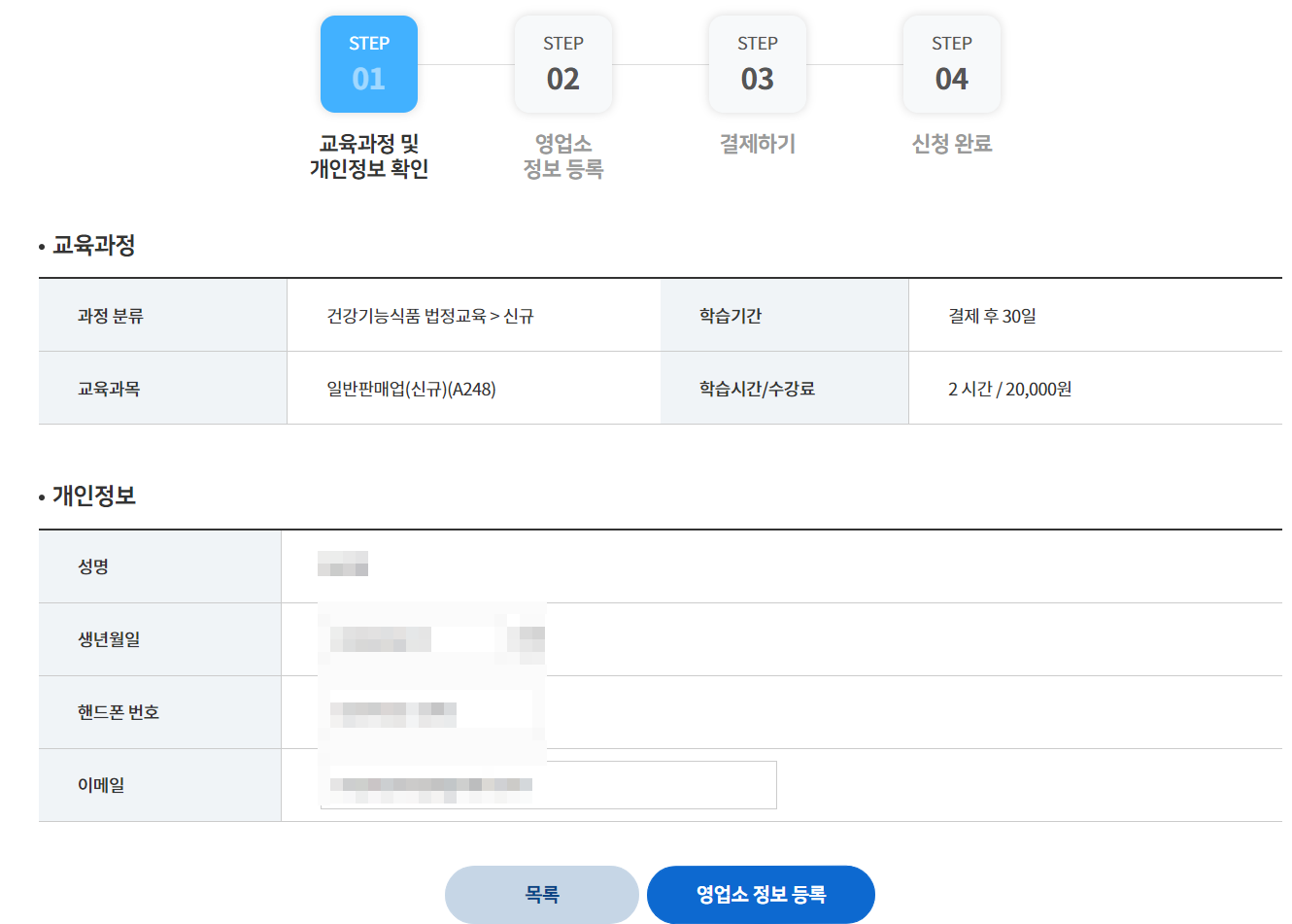 교육과정을 확인하고 개인정보와 영업소 정보를 입력한다. 입력이 다 되었다면 결제하기를 진행해 앞서 선택했던 '일반판매업(신규)'의 수강료인 2만원을 결제하면 신청이 완료 된다.