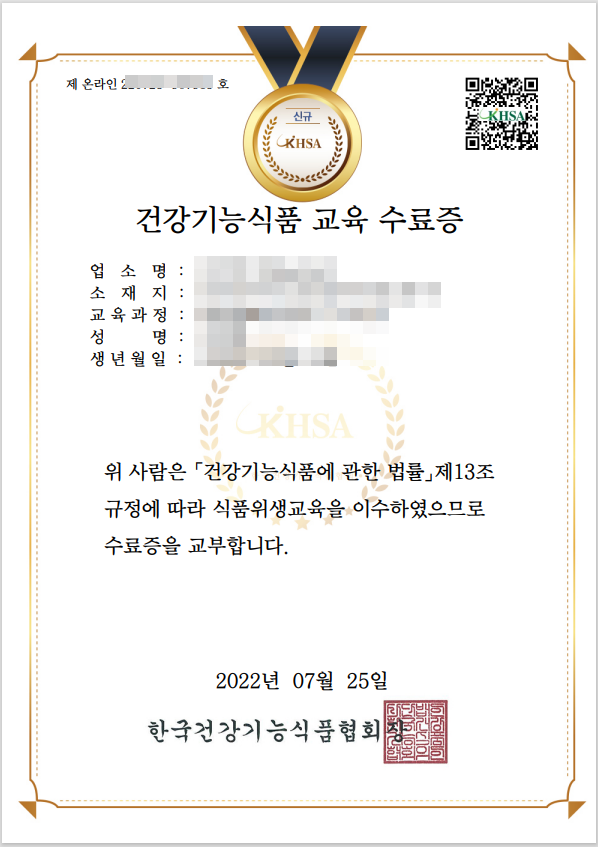 건강기능식품 판매를 위해 앞서 건강기능식품 교육을 이수하고 수료증을 발급 받았다. (건강기능식품 교육 수료증 발급 후기 & 발급 방법 보러가기 -> 건강기능식품 판매 구비서류: 건강기능식