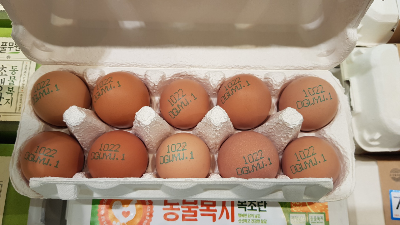 계란 판매하는 매대에 종류도 많고 수량도 많다. 껍질에 있는 표시를 자세히 보도록 하겠다.