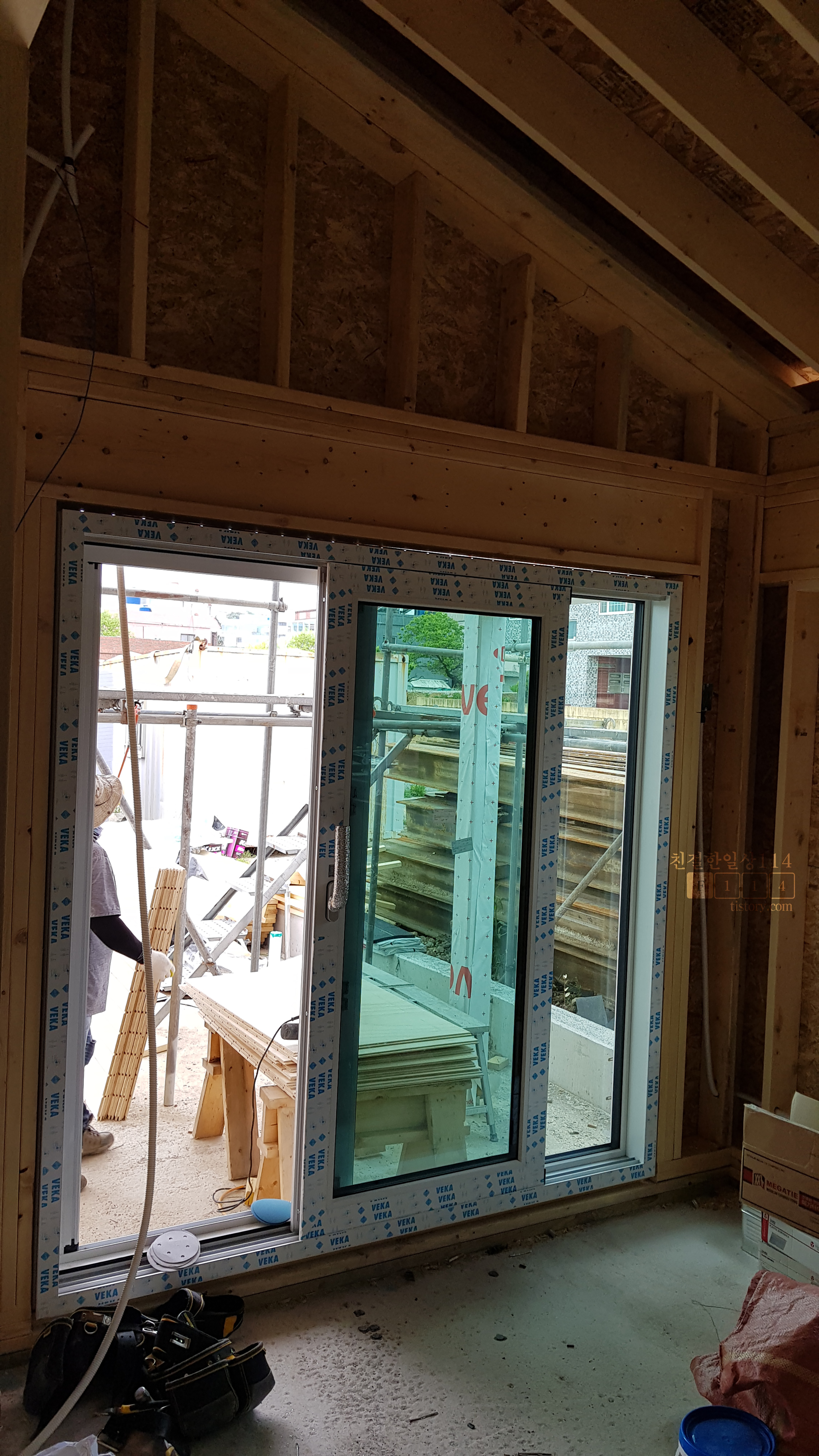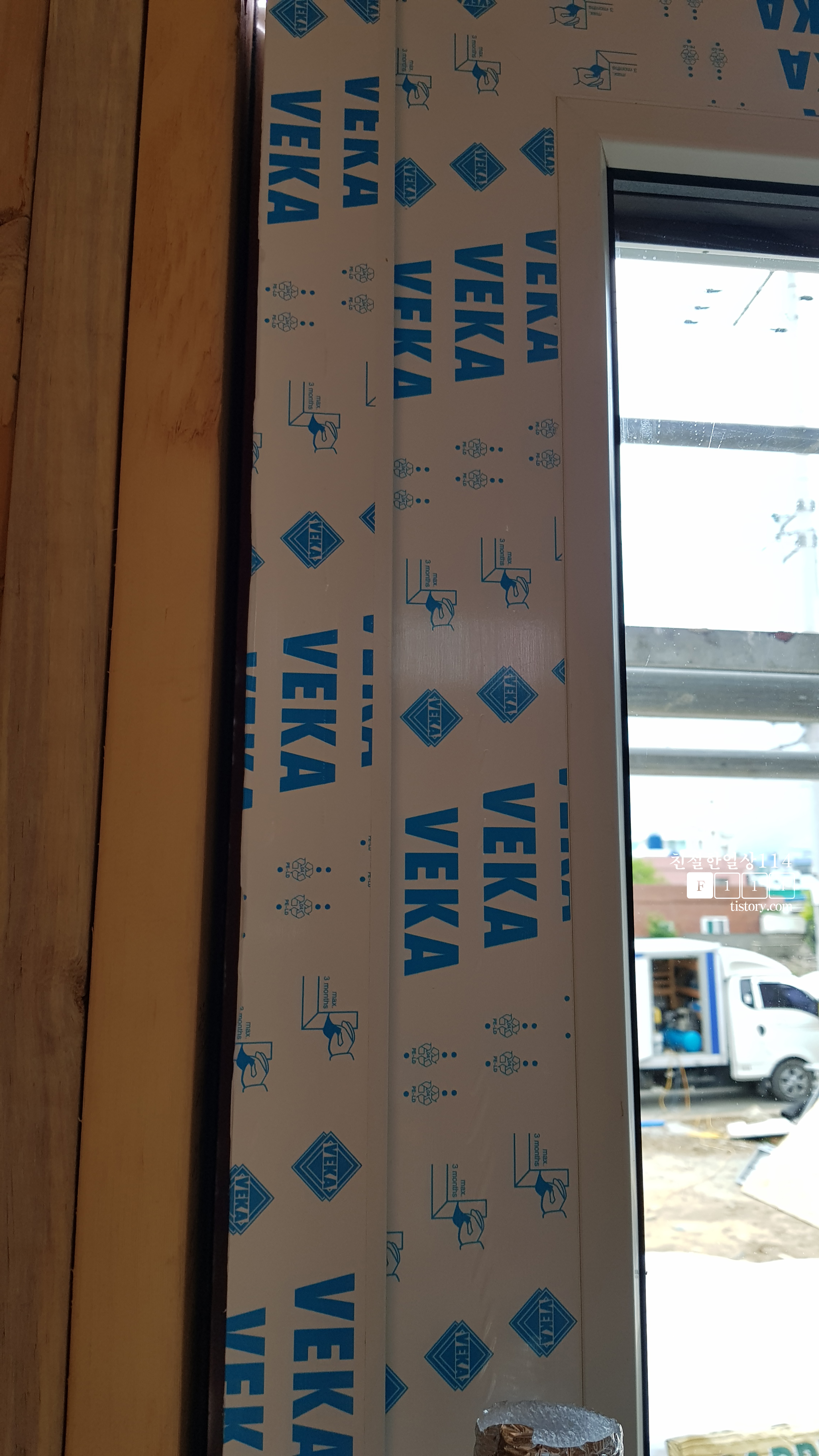 창호의 프레임시공시 외벽쪽으로 사계절용 기밀테이프로 테이핑해준다. 테이핑 방법은 사진과 같다. 양쪽 사이드와 밑부분은 투습방습지 바깥쪽에 붙이고 창문 위쪽은 방수테이프 안쪽으로 테이프를 붙이는 방식이다. 이는 혹시 있을 외부의 빗물이나 습이 창문 프레임으로 흘러들어가지 안도록 하기 위함이다. 이런 디테일함이 좋다. 하자는 이런 디테일함을 제대로 하지 않았을때 발생 한다.