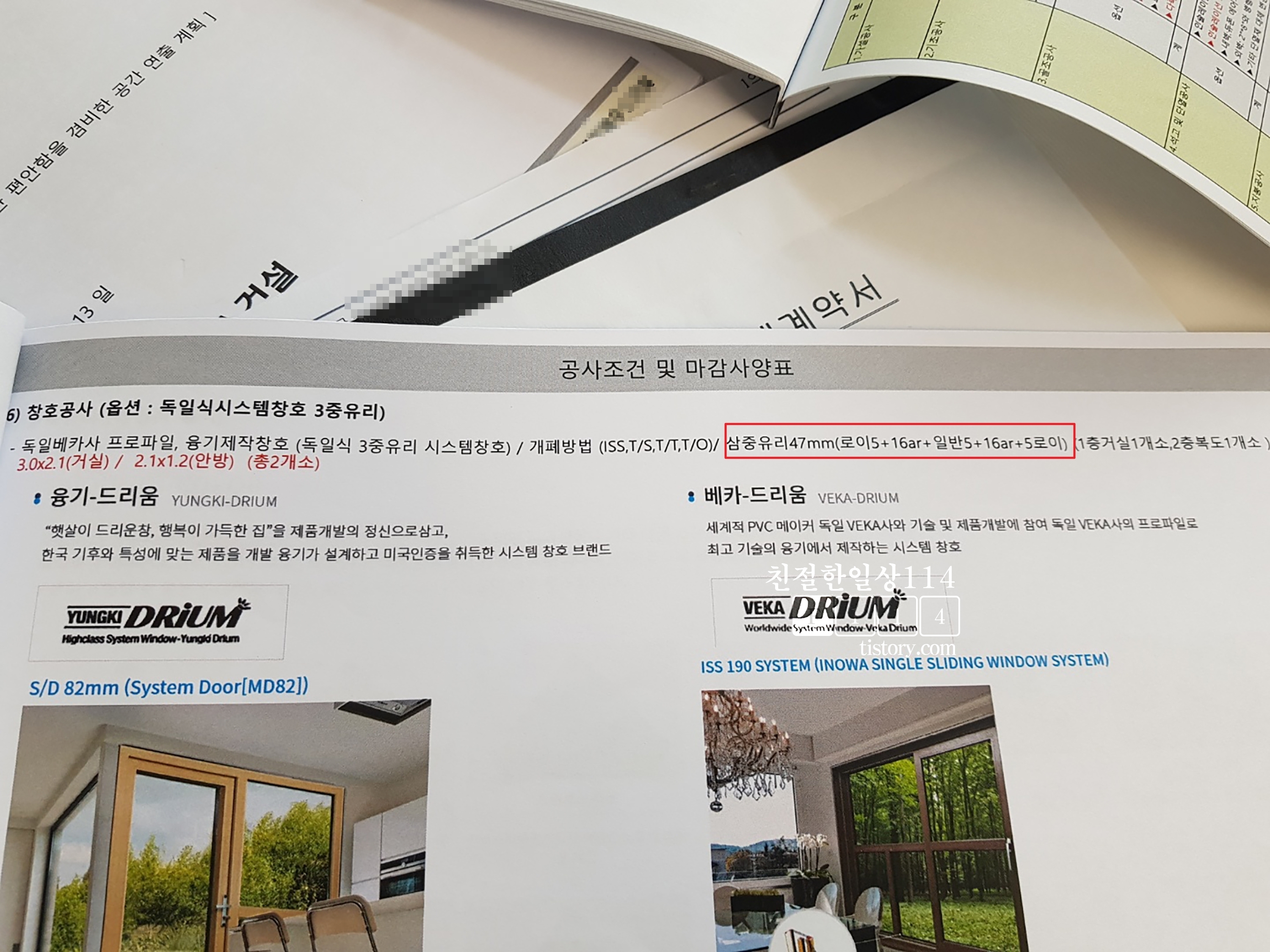 마감사양표: 삼중유리 42mm = (로이5 + 16air + 5일반 + 16air + 5로이) 로 되어있다. 업그레이드하는 곳이 거실과 안방 2개소로 되어있는데 다이닝룸이 빠졌다. 이런 오타나 실수가 있을때는 창문을 들이기전 계약대로 시공이 되는지 재확인을 해봐야한다. 다 만들고 나서 빠진부분을 다시 하려면 시간도 걸리고 복잡해진다.