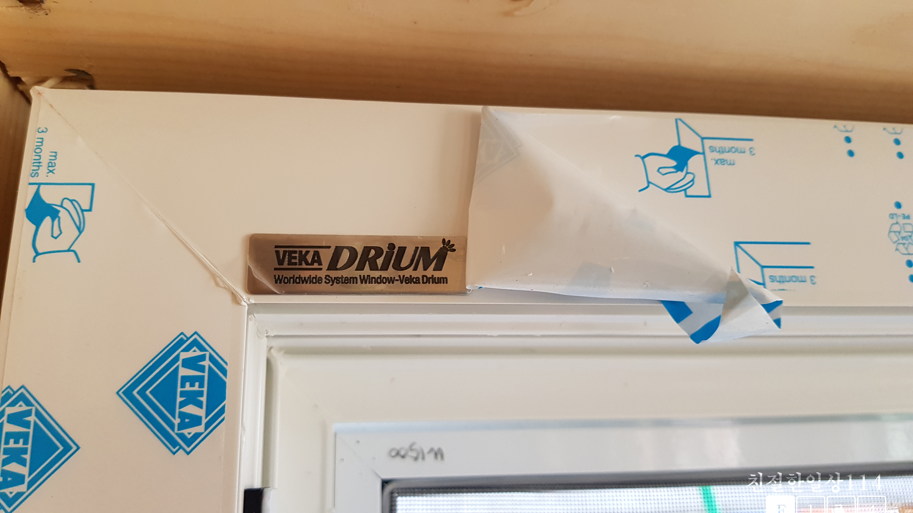 창문 프레임에 독일 베카사의 보호포장필름이 붙어있다.
