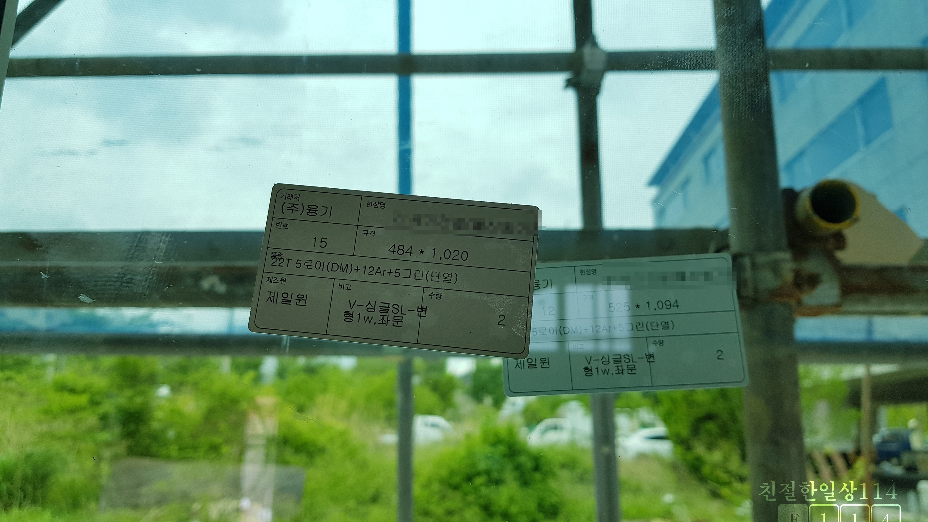 시공된 유리에 부착된 내용을 보면 42T 5로이(DM) +16air + 5그린 + 16air +5로이(DM)(단열) 이라고 표기되어있다. 이는 '총두께 42mm = 5mm유리 + 16mm 진공 + 5 투명유리 + 16mm 진공 + 5mm 유리' 라는 뜻이다. 계약한 그대로의 제품이 맞다.