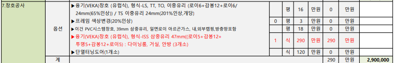 안방, 다용도실, 거실 3군데의 2중 유리에서 3중 유리로 변경하는데 추가된 비용은 290만원이 들었다.