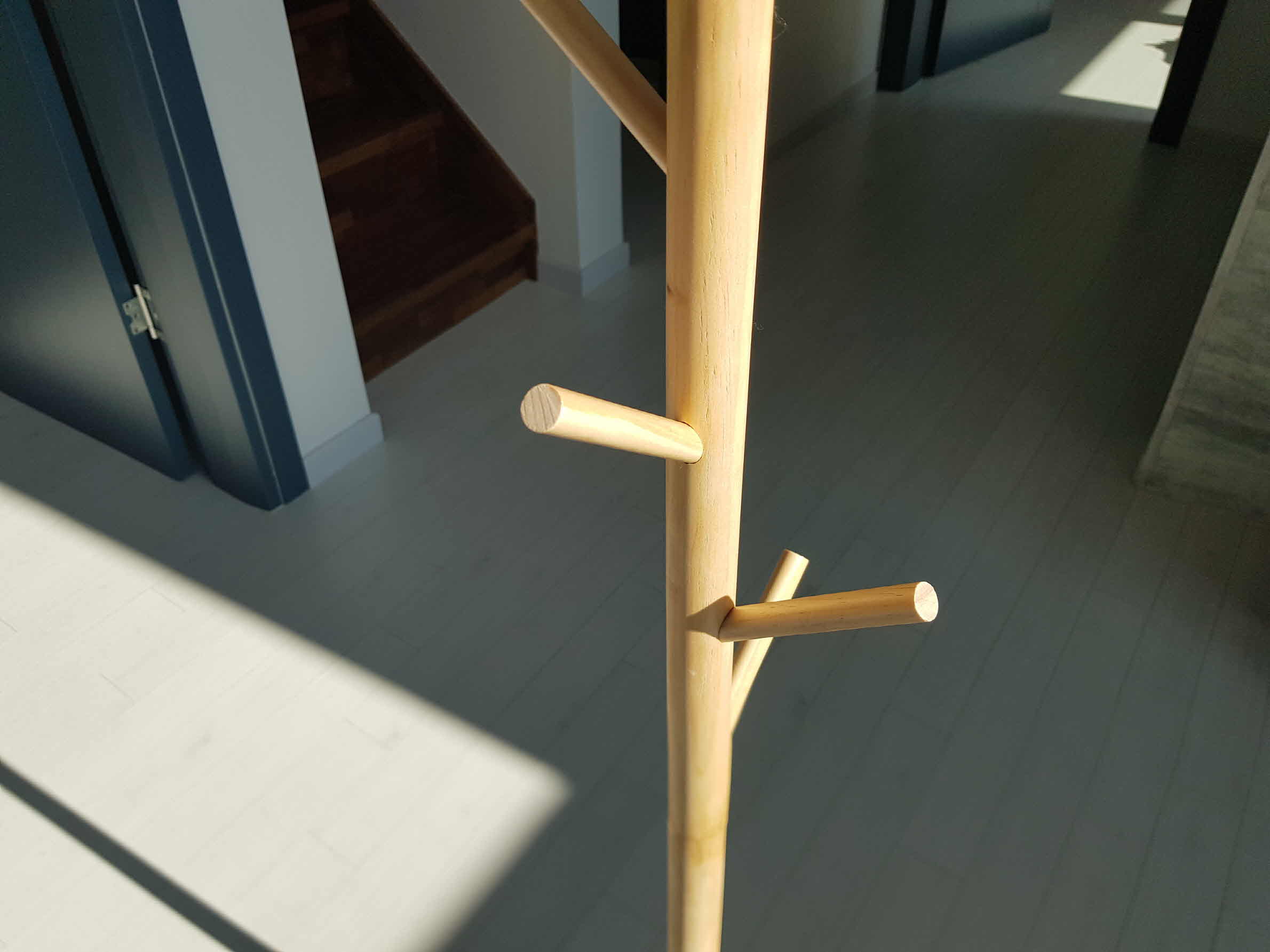나무의 굵기가 가늘고 무게가 가벼워서 한쪽으로 외투를 2개를 걸면 넘어진다. (내구성 만족도 2점) 이 부분은 좁은 공간에 두기 위해 다리 사이즈를 좁은 제품으로 고르다 보니 어쩔 수 없는 부분이라 여겨진다.