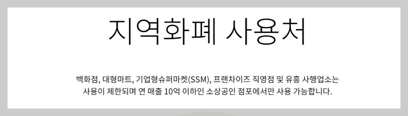 지역화폐는 지역내 영업 중인 소상공인의 활성화를 도모하기 위한 것으로 전국에 걸쳐 매장이 있는 대형마트나 매출 10억 초과되는 기업형 슈퍼마켓, 백화점 그리고 프랜차이즈 직영점과 같은 매장에서는 사용할 수 없다.