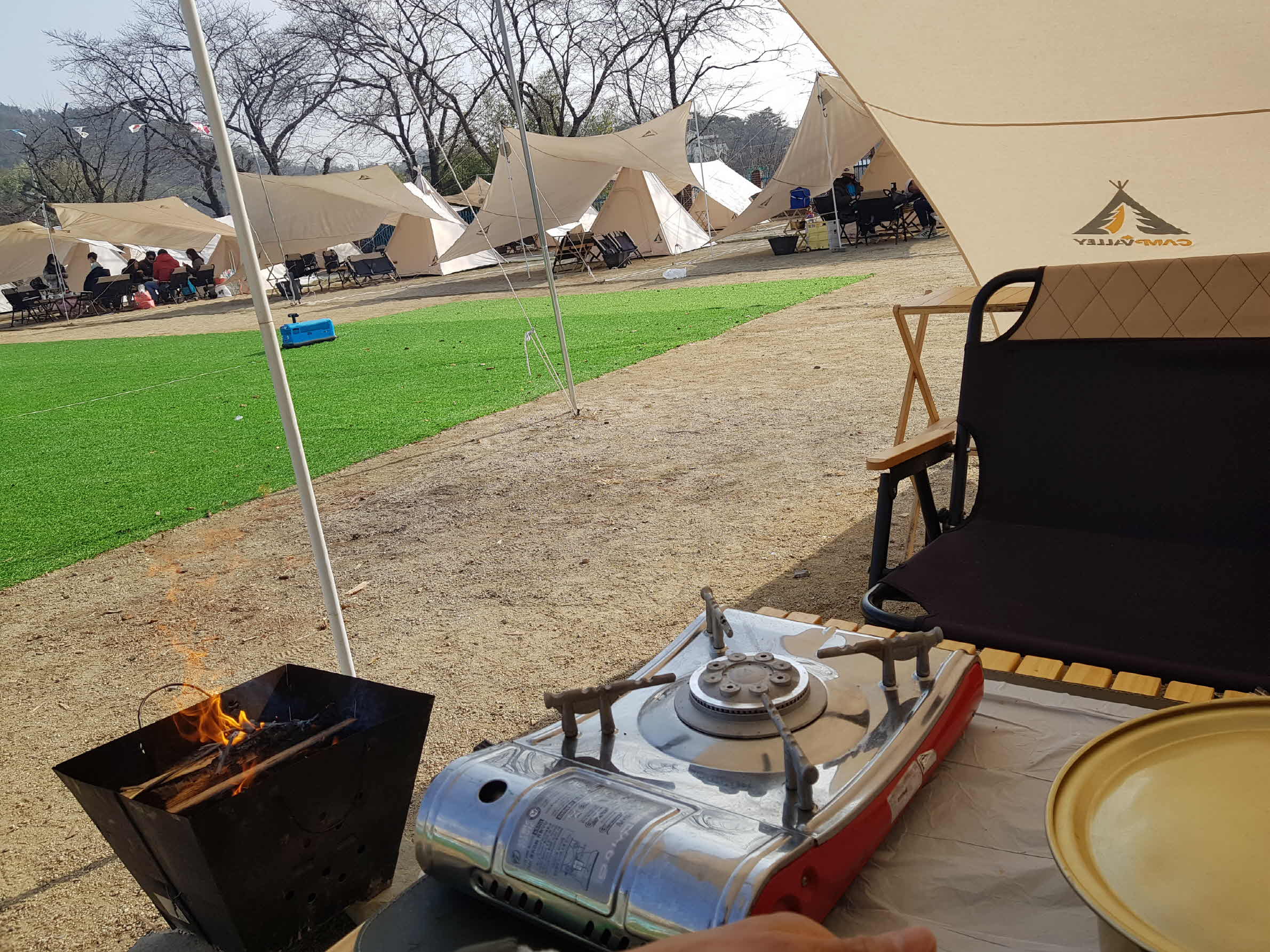 텐트에 있는 화로에 장작을 넣고 토치로 5분정도 가열하니 불이 붙는다.