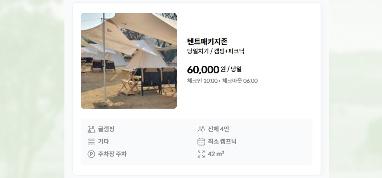 4인기준이며 인원 1명 추가시 1만 원 추가요금이 발생한다. 1 텐트에 최대 수용인원은 6명까지이다.