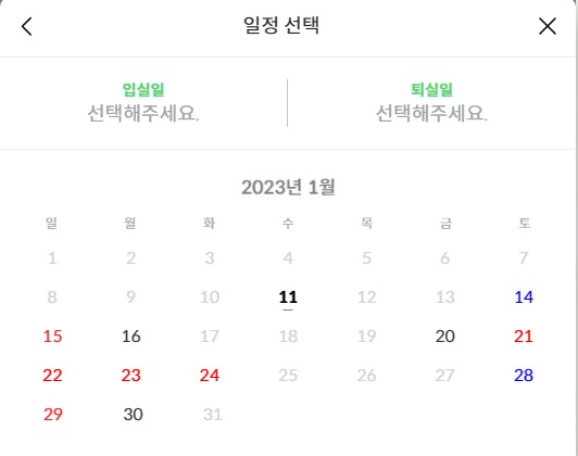일정선택을 클릭하면 예약이 가능한 날짜가 진한색으로 표시되어 보여진다.