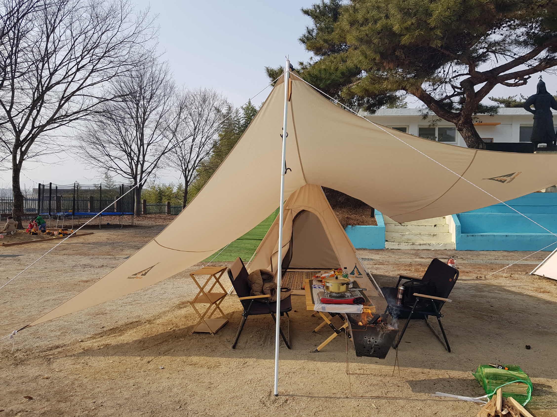 학교 정문으로 들어가 운동장에 주차를 하고 예약한 텐트로 짐을 옮긴 뒤 "관리실 & 매점"으로 가서 캠지기(사장님)에게 도착했노라 보고하면 안내를 해주신다.