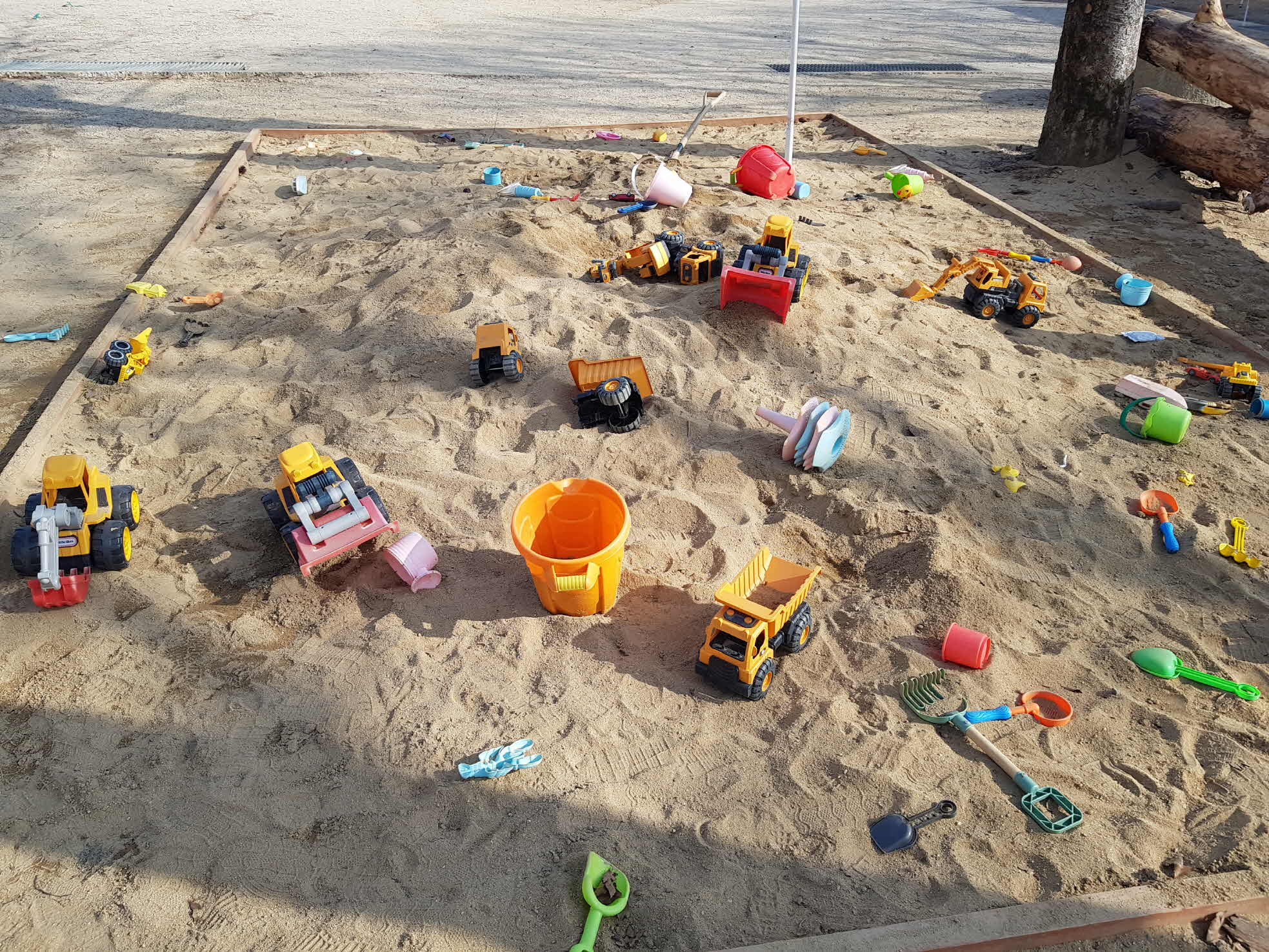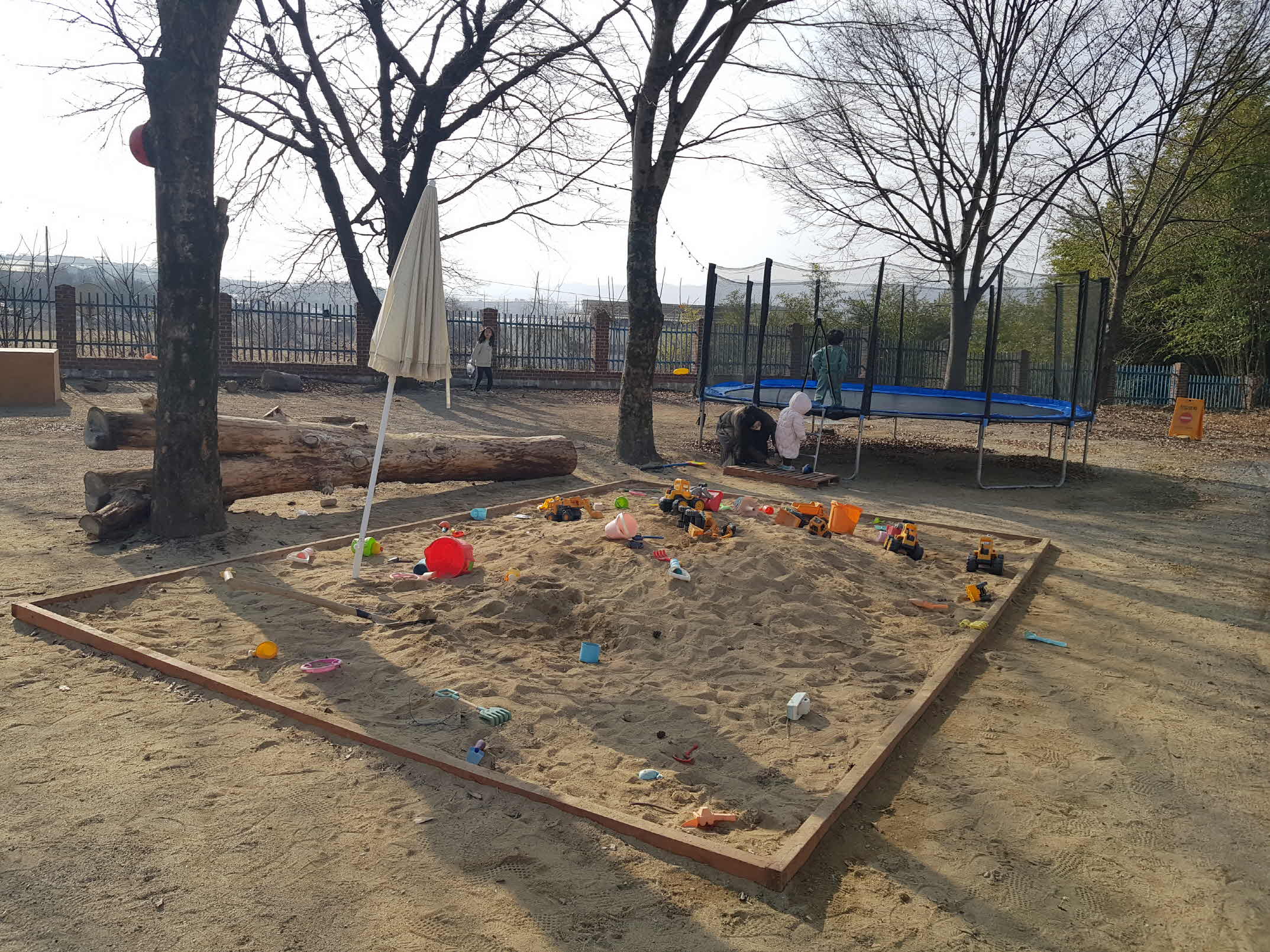 운동장 모퉁이에 있는 모래놀이장. 모래놀이 장난감도 많이 있어서 아이들이 손에 흙 뭍히고 가지고 놀기 좋다.