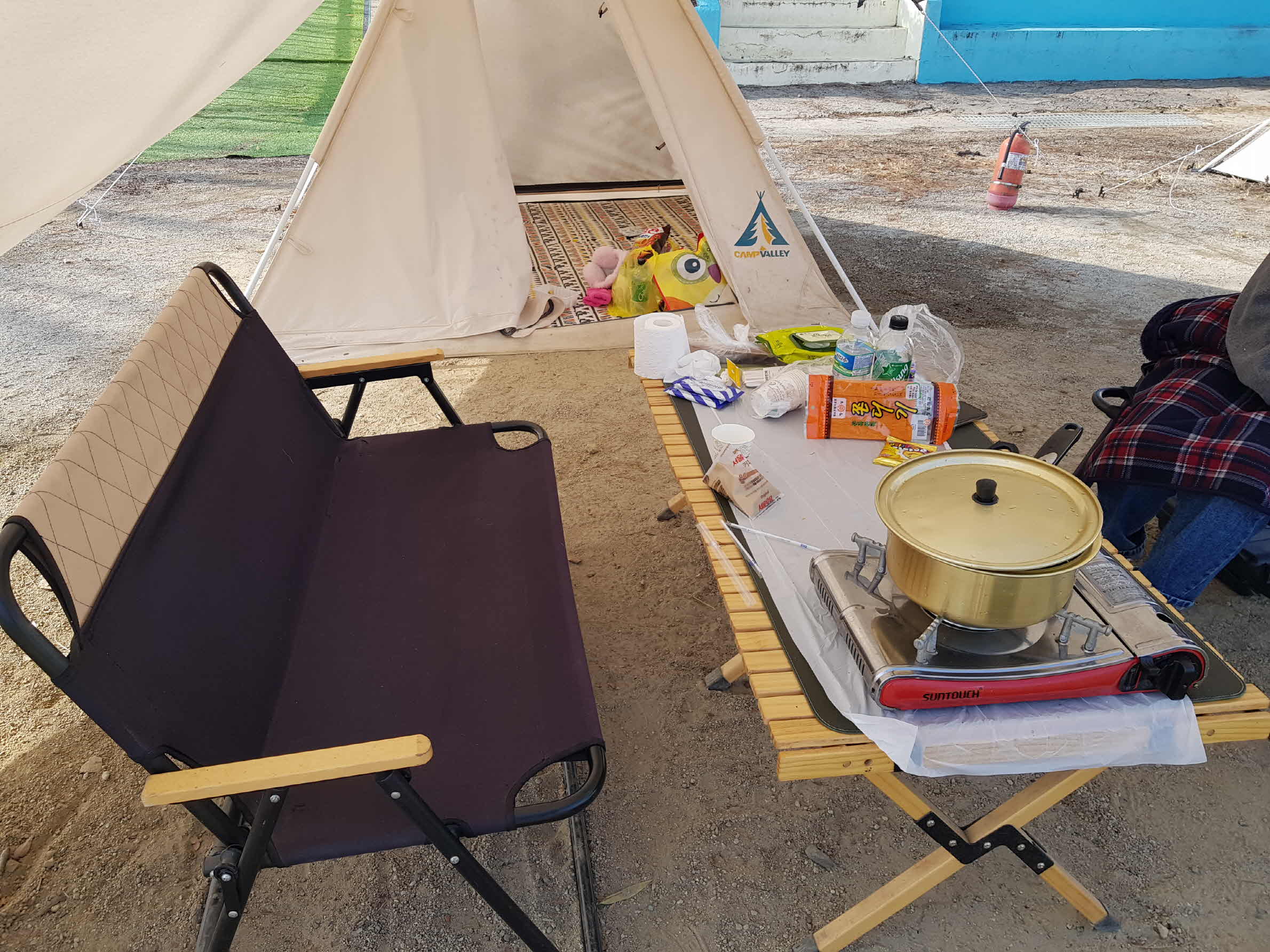 캠프 벤치형 의자와 나무테이블이 텐트앞에 놓여있다. 위에는 타프가 쳐져있어 햇볕을 가려주고 텐트별로 공간을 나눠주는 역할을 하고 있다.