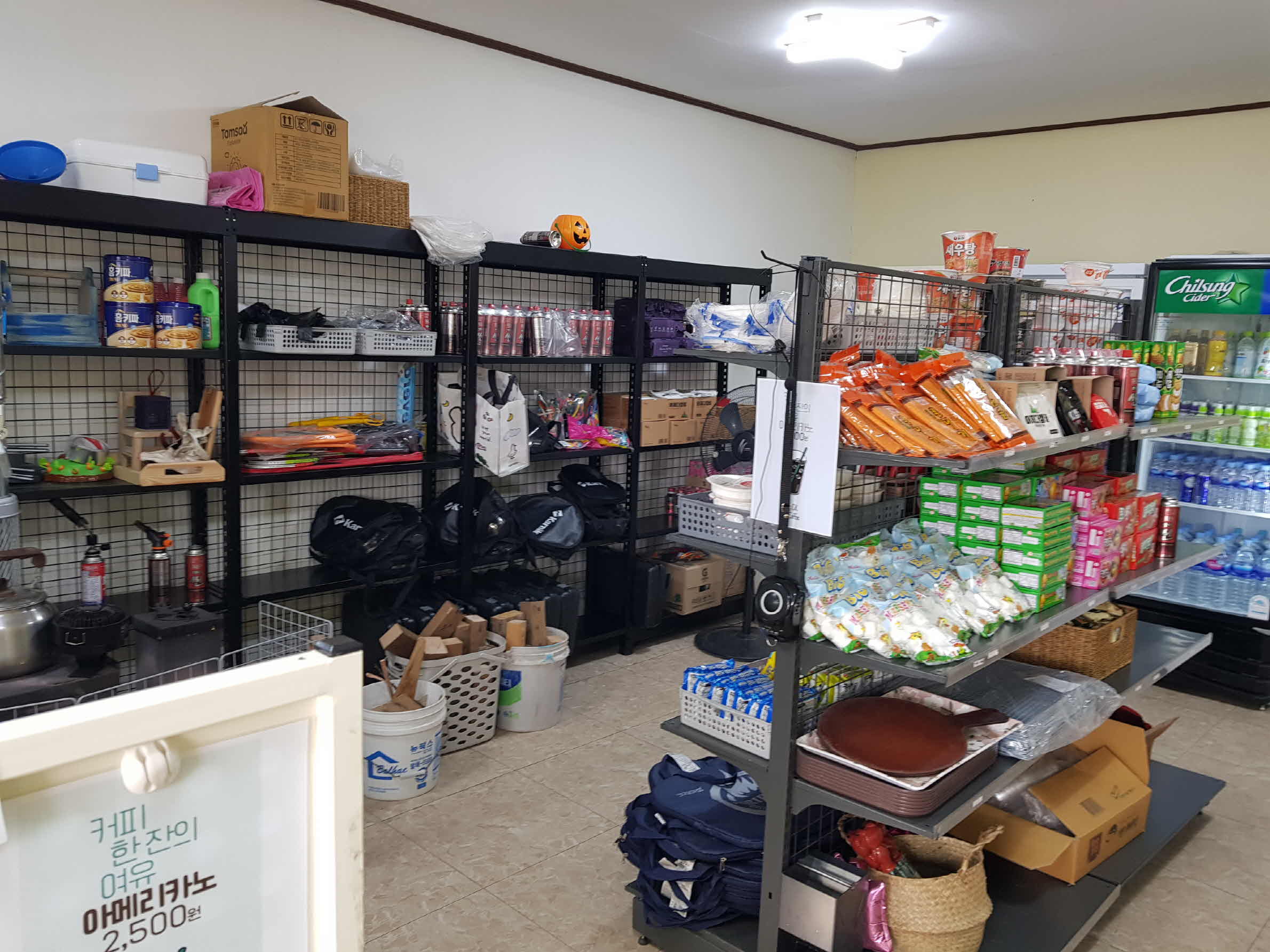 캠프에 필요한 작은 도구, 소품들과 라면, 과자, 음료 등을 진열해 놓고 판매되고 있었다.
