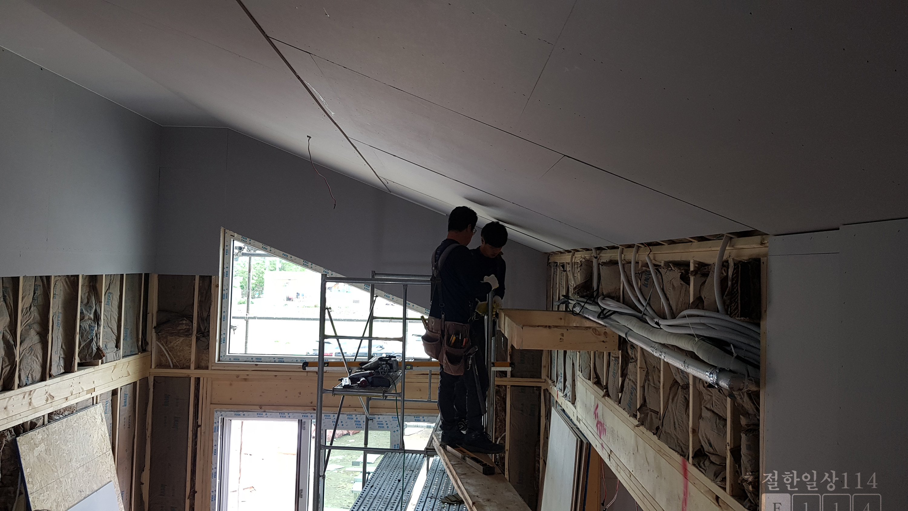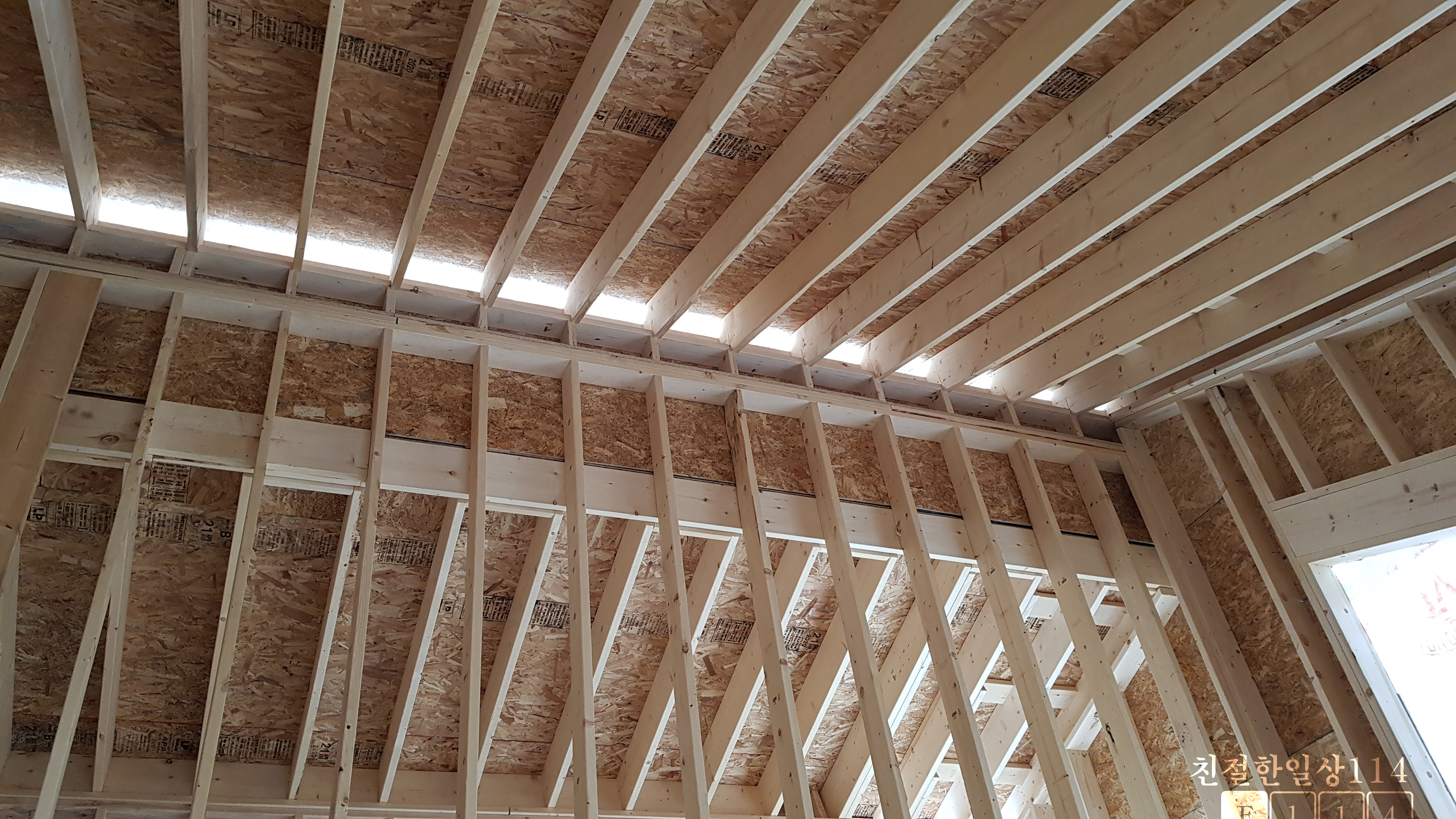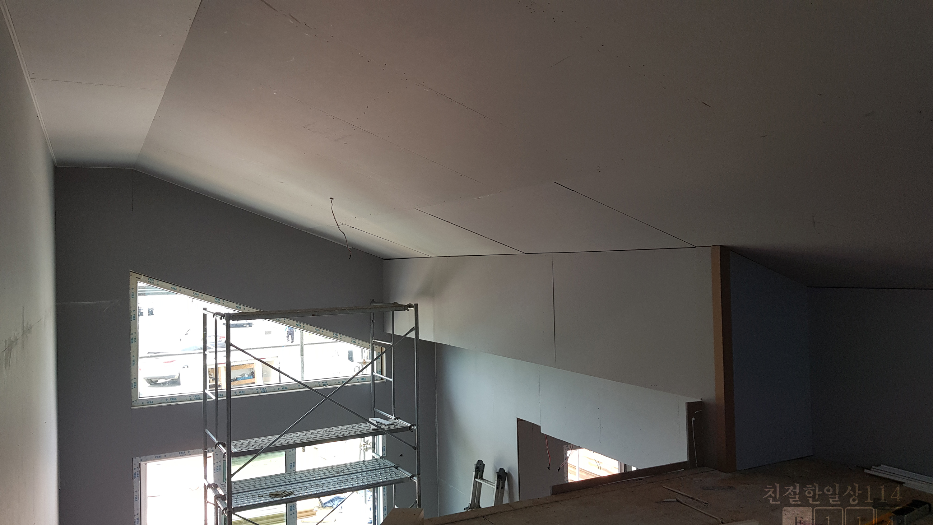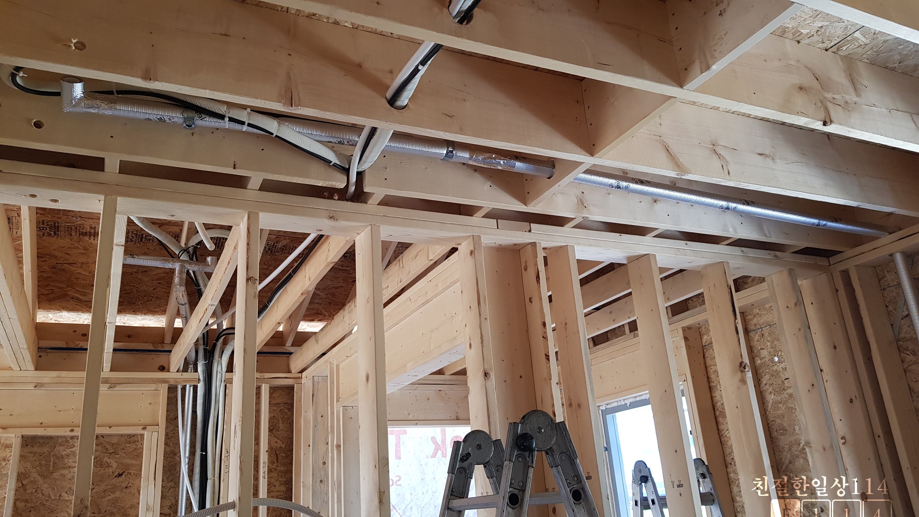 이번에 건축중인 집은 거실이 오픈천장이며 경사진 지붕의 형태를 따라 천장도 기울어진 모양을 띄고 있다. 주방과 같이 있는 다이닝룸은 반오픈천장으로 이곳 또한 경사진 천장이다.