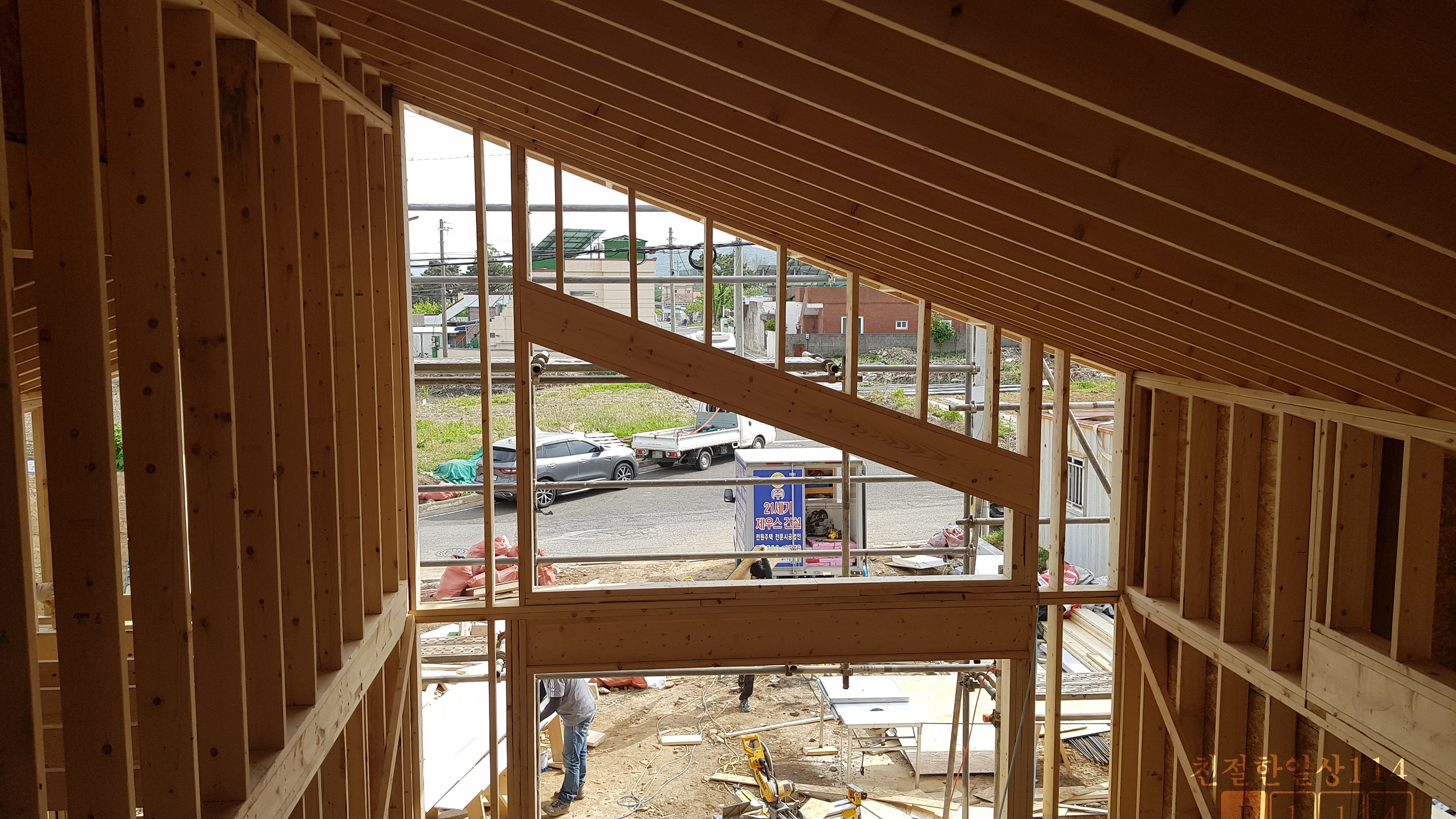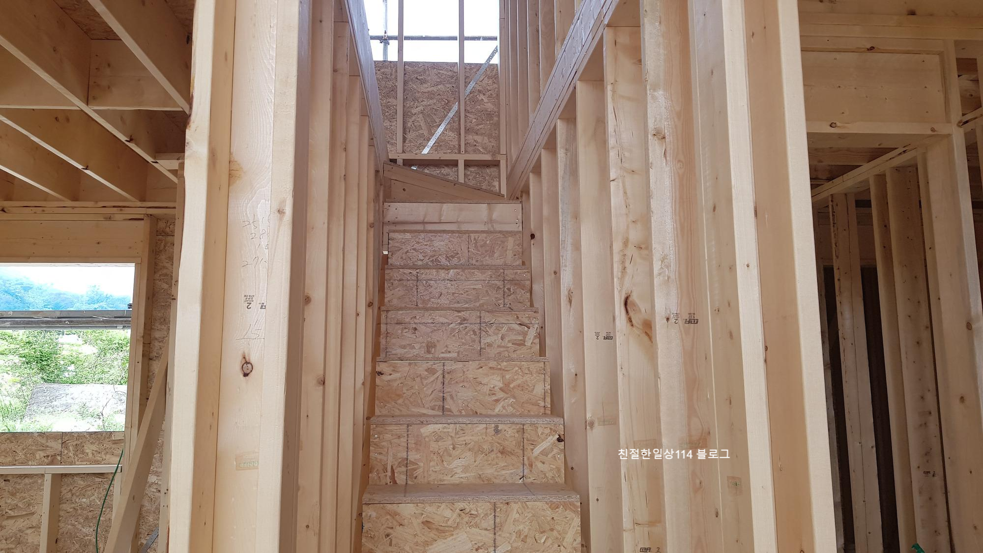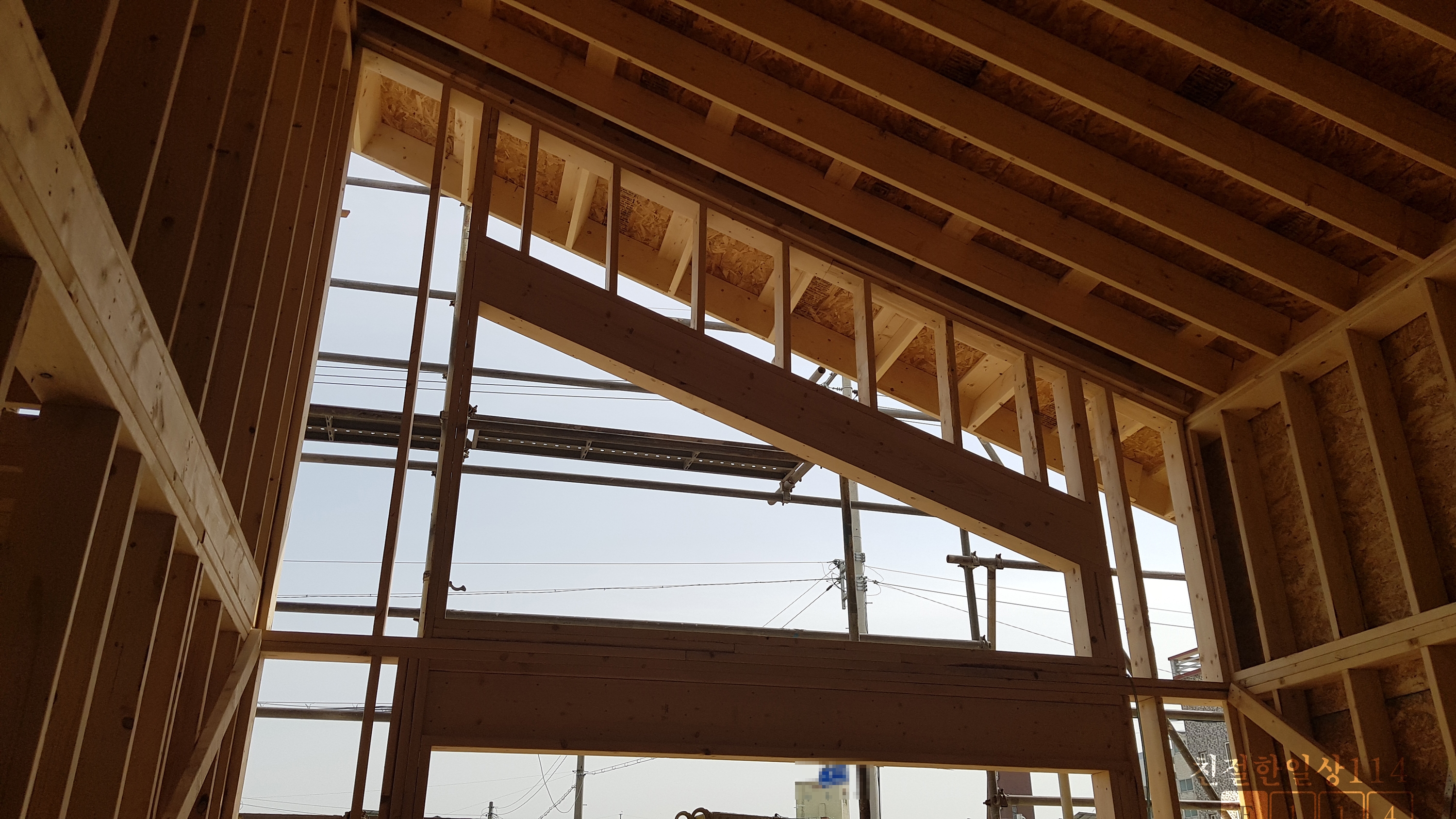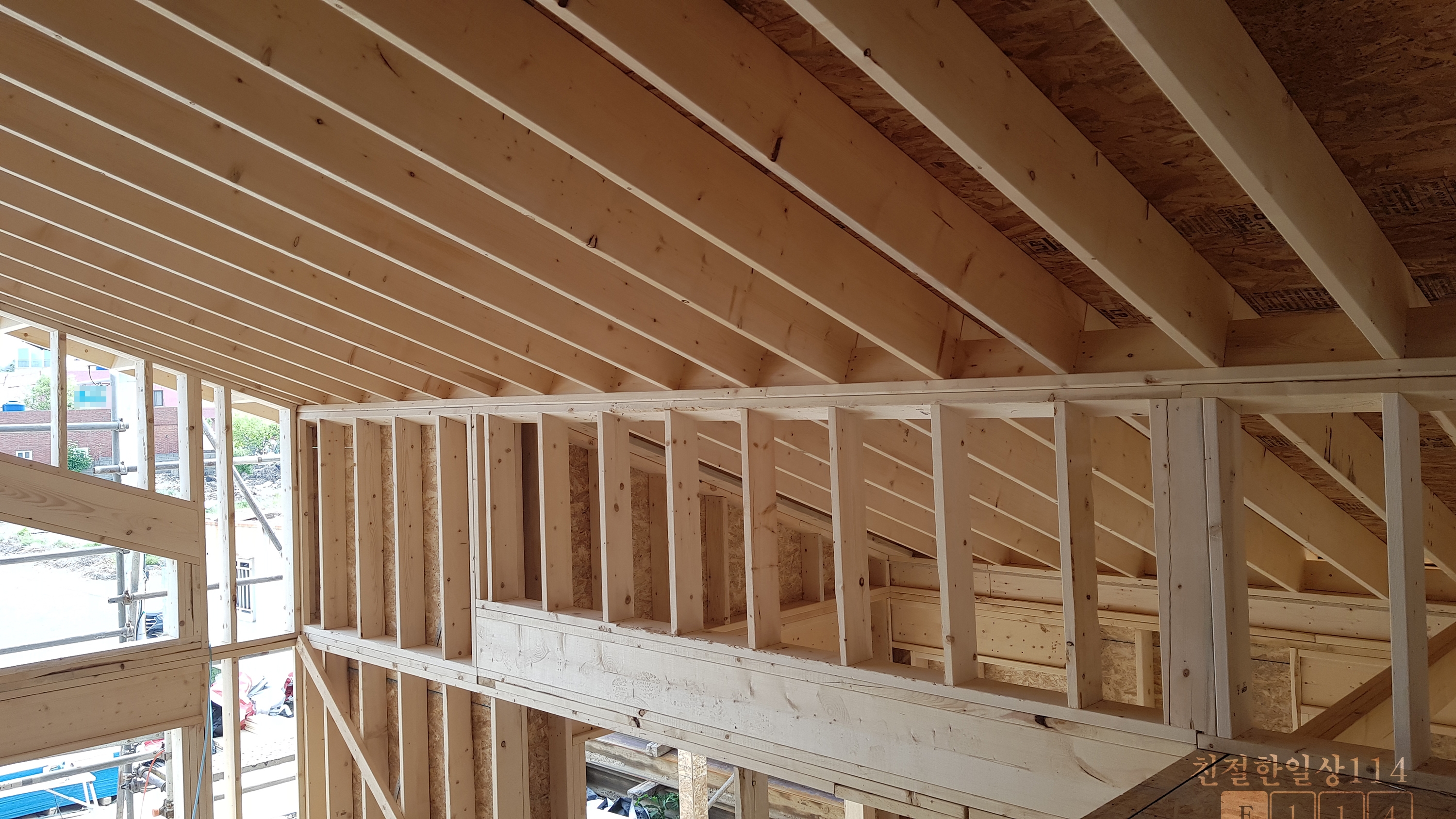 이번에 건축중인 집은 거실이 오픈천장이며 경사진 지붕의 형태를 따라 천장도 기울어진 모양을 띄고 있다. 주방과 같이 있는 다이닝룸은 반오픈천장으로 이곳 또한 경사진 천장이다.